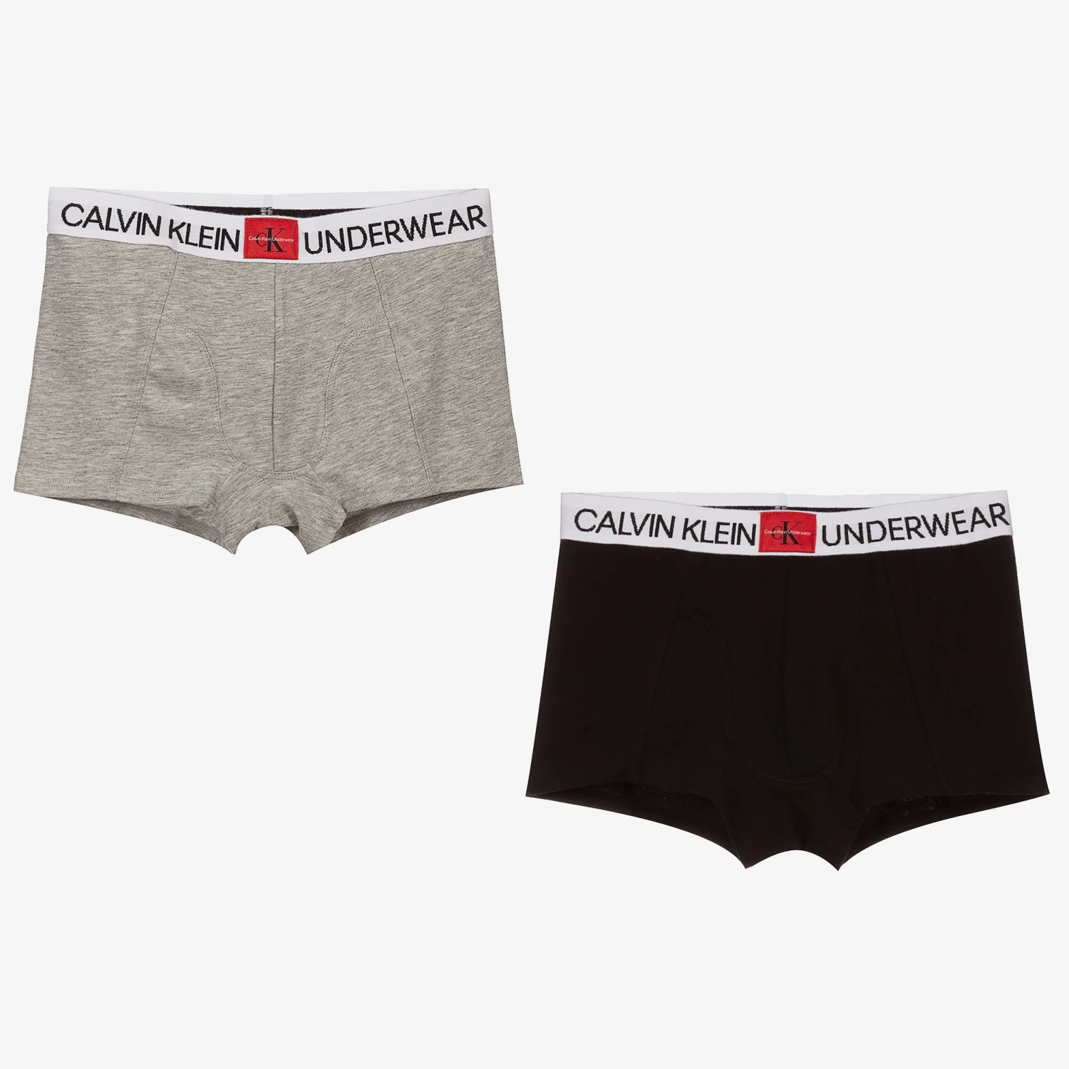 Pack of two, black and grey boxer shorts for boys by Calvin Klein. Made in soft cotton jersey, they have a white elasticated waistband with black logo lettering and a red embroidered label.