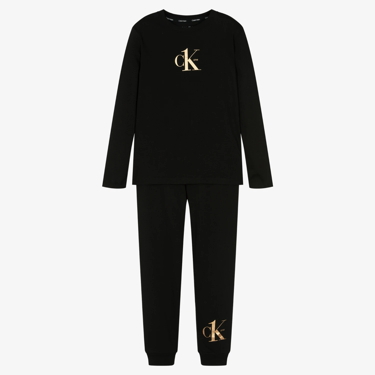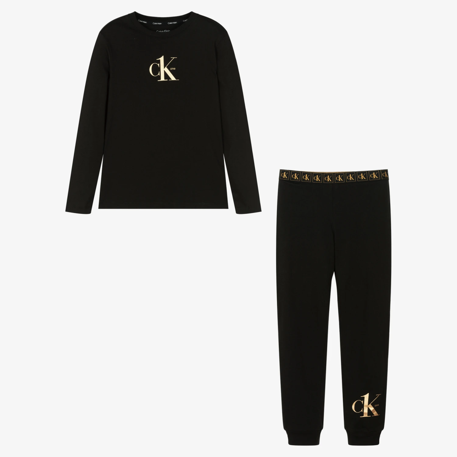 Black cotton pyjamas for boys by American brand Calvin Klein Jeans. Soft and lightweight, they are made in jersey for a comfortable sleep as well as all-day relaxing. The designer’s monogram logo is printed in gold on the front of the top and around the stretchy elasticated waistband.
