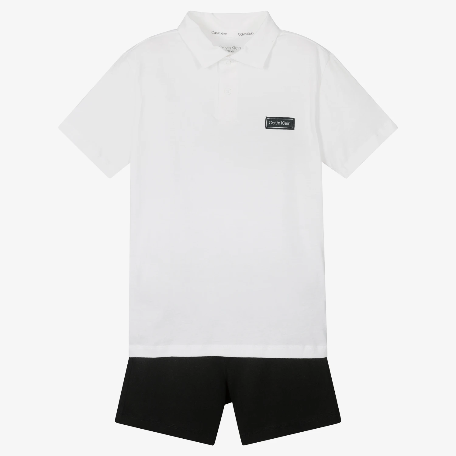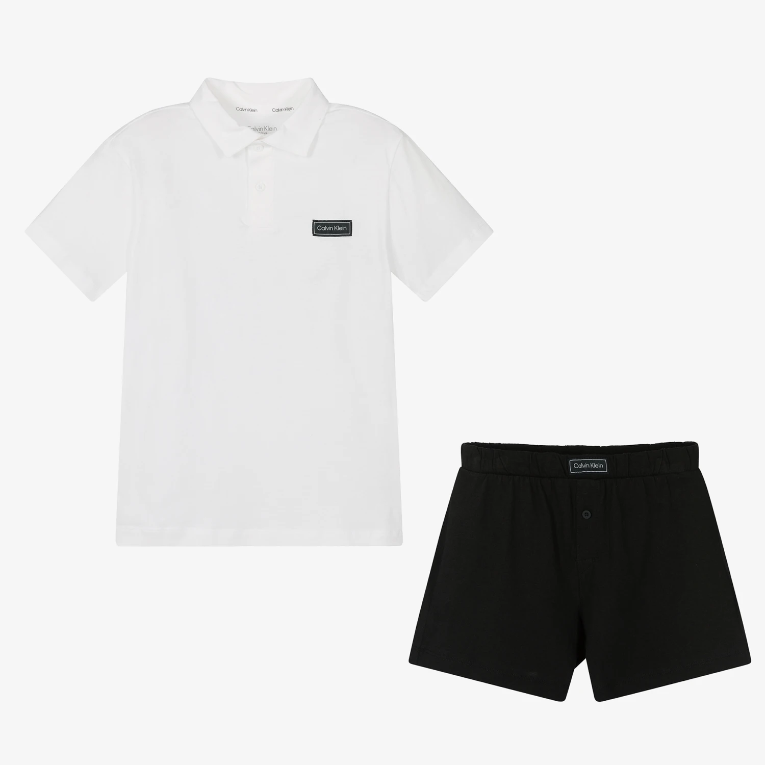 Boys black and white pyjama shorts set by Calvin Klein. Ideal to be worn as loungewear and for sleeping, the cotton jersey top has a collar and front button fastenings with a logo tag stitched at the chest. The shorts have an elasticated waistband and matching logo tag. The set comes in a cotton jersey drawstring bag with logo branding.