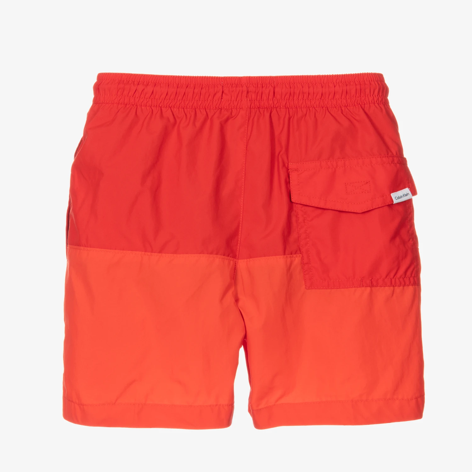 Swim shorts for boys by Calvin Klein, in red tonal colourblocks with white logo print on the front. They are made in lightweight recycled polyester with a black mesh lining are are water-repellent for quicker drying. The elasticated waistband has an adjustable drawstring for a good fit and there are concealed side pockets and a patch pocket on the back.