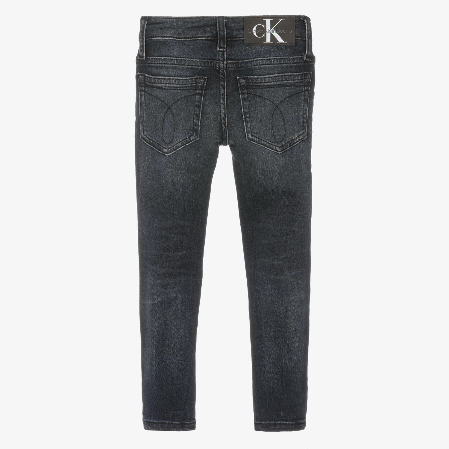 Faded blue-black skinny jeans for boys by American brand Calvin Klein Jeans. There are logo details on the button fastenings, coin pocket, and back waistline. This classic five-pocket style fastens with a zip and popper and has a useful adjustable waist. They are slim through the hip and thigh, with a skinny leg.
