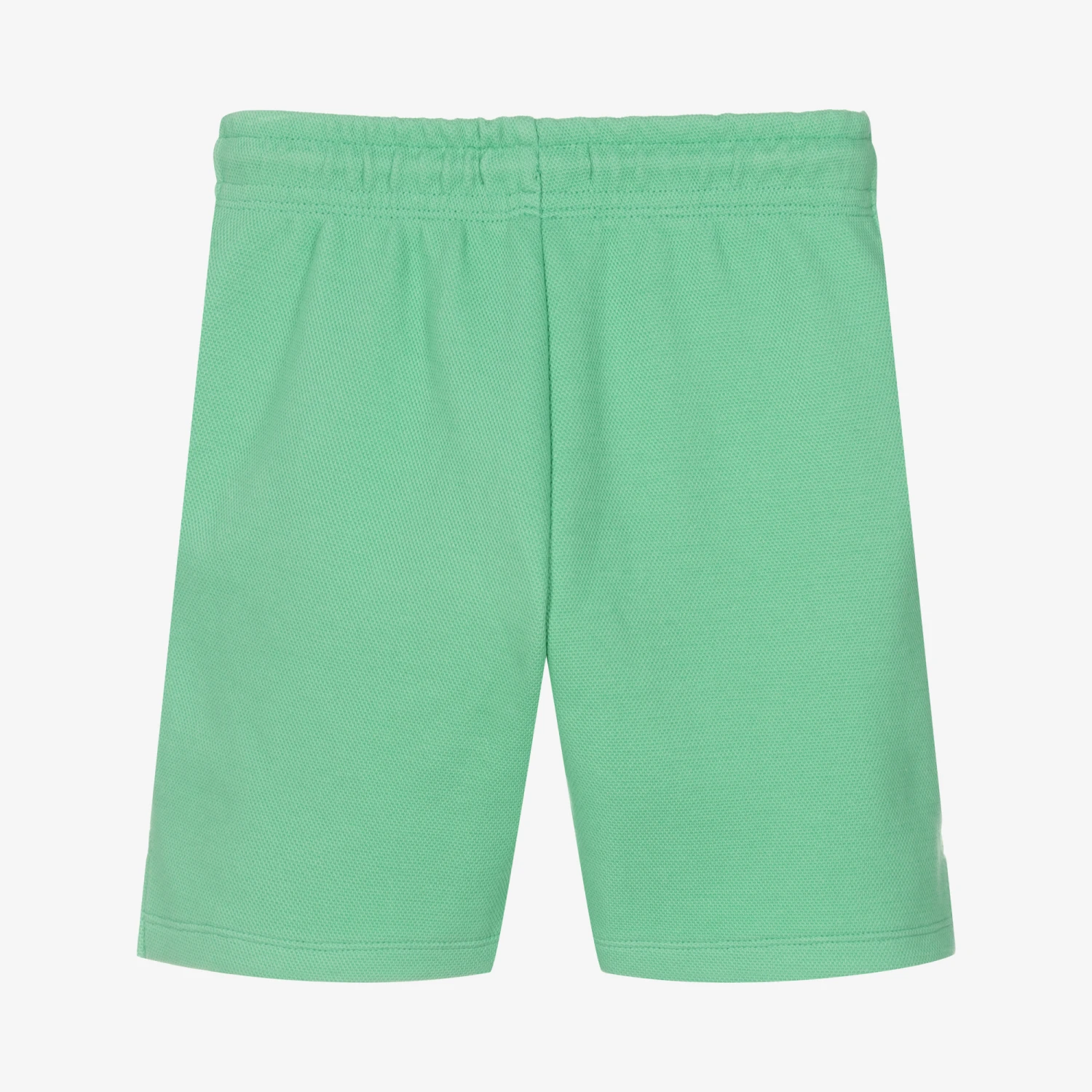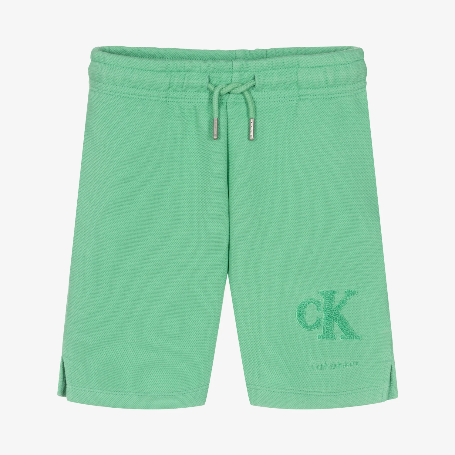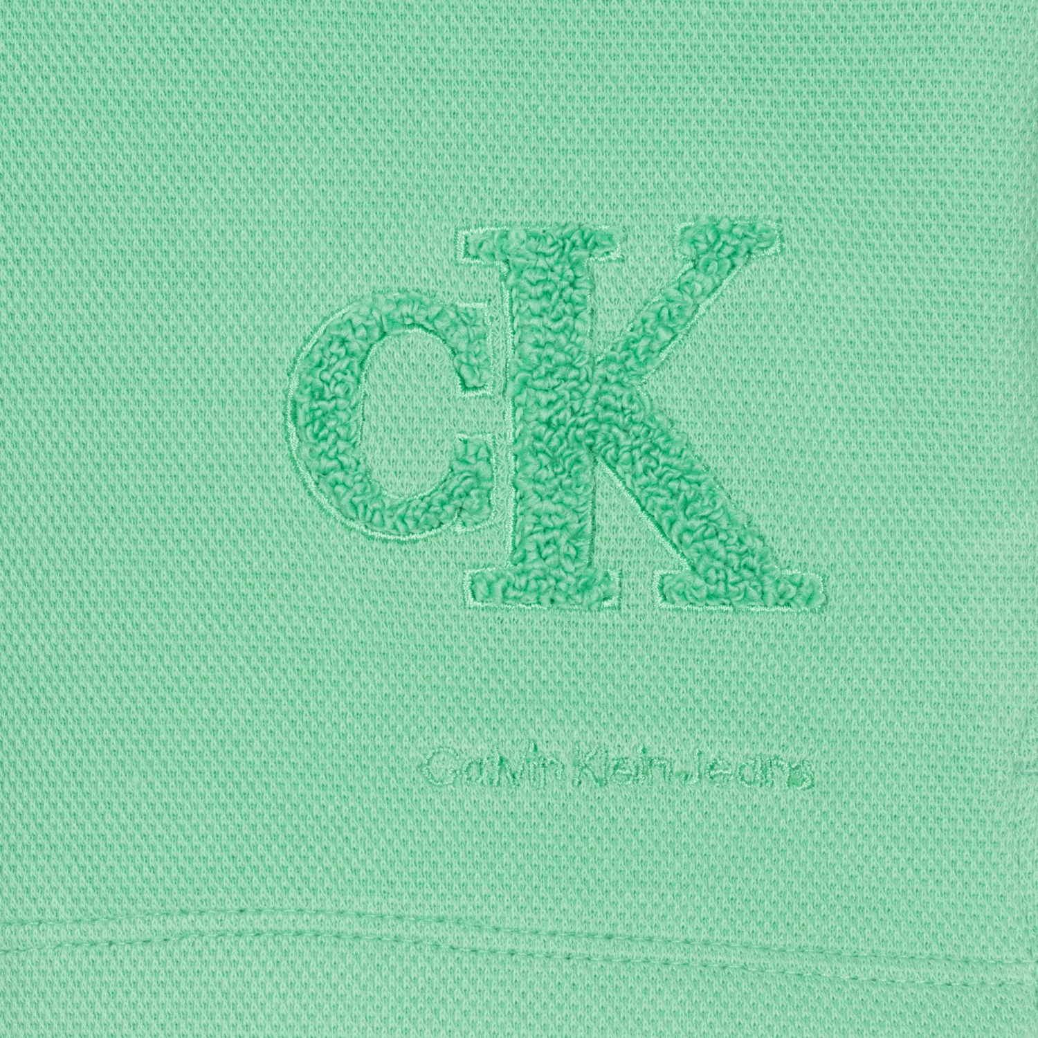 Pastel green cotton-mix shorts for boys from Calvin Klein Jeans. These cool shorts are enhanced by the soft piqué fabric, an unexpected and interesting material to add texture and dimension to an outfit. Appliquéd to the front is a Calvin Klein monogram logo in soft bouclé, with an embroidered logo detail beneath. They have handy side pockets and a branded drawstring on the elasticated waist.