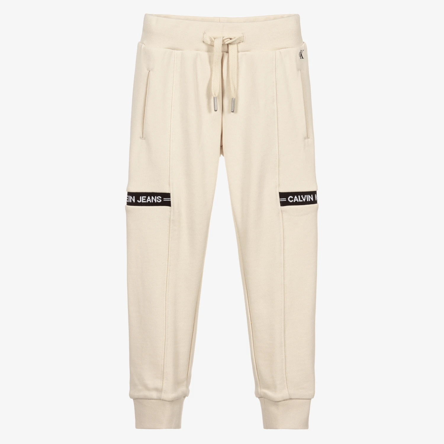 Ivory joggers for boys by American designer Calvin Klein Jeans, made in mid-weight sweatshirt jersey. They have a useful drawstring waistband, with the brand’s logo printed on one side in black. There are ribbed black and white logo panels on the thighs.