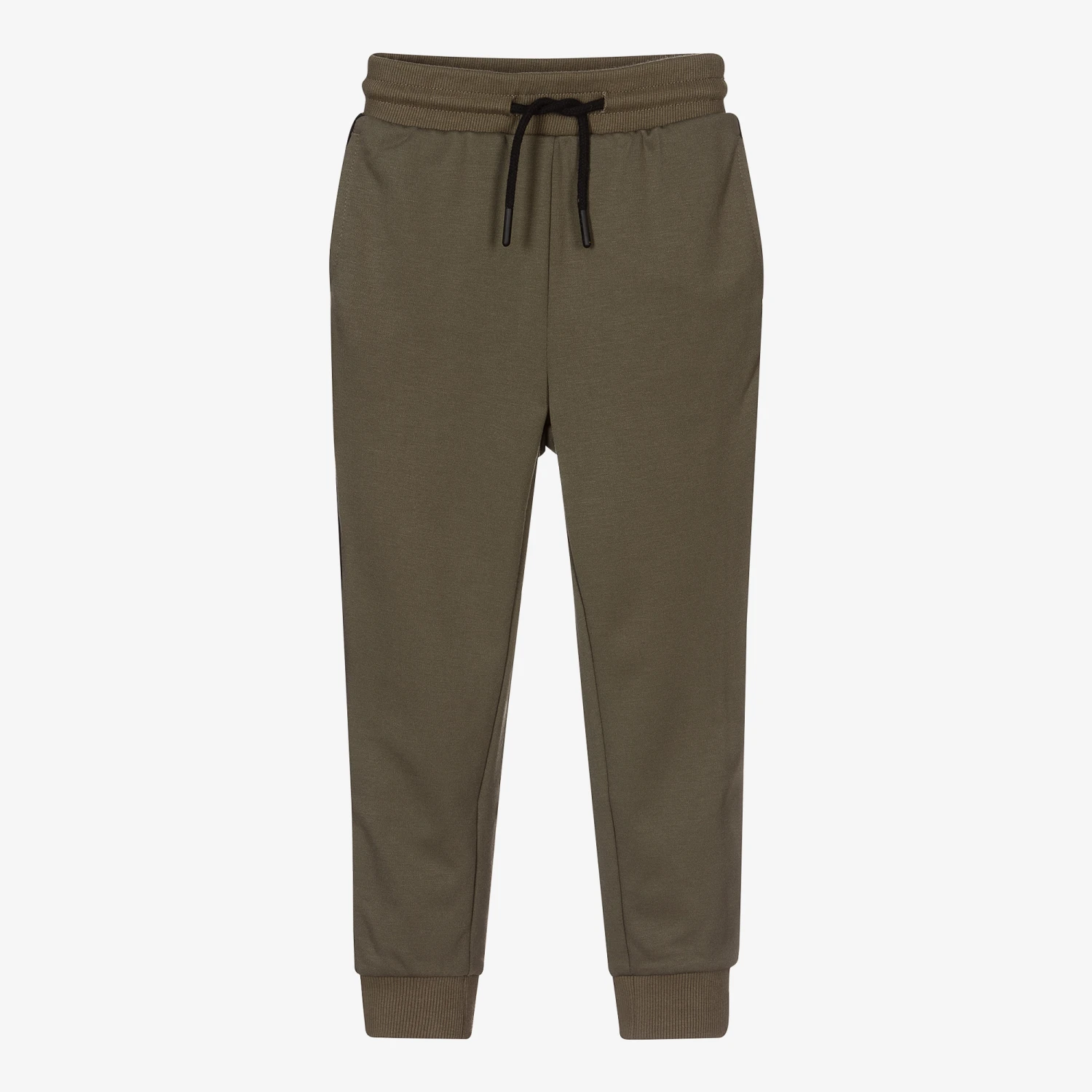 Khaki green joggers for boys, by Calvin Klein Jeans, made in soft Milano jersey. Made from a blend of viscose and Repreve® recycled plastic bottles, they have the brand’s classic CK logo printed on the back pocket, and a black logo trim down the sides.