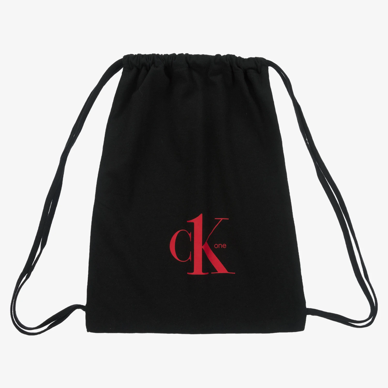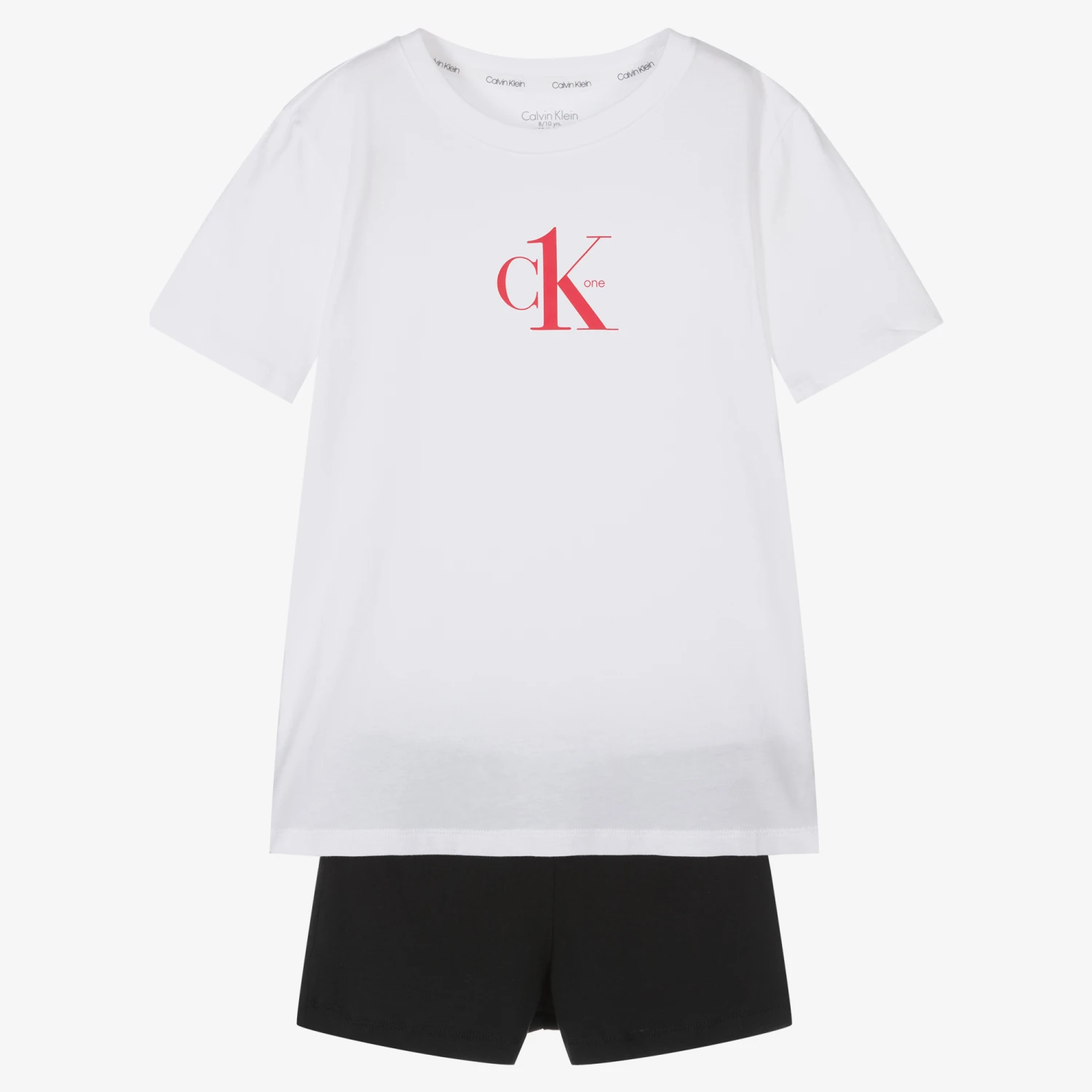 White and black pyjama shorts set for boys and girls by Calvin Klein, made in soft and comfortable cotton jersey. The white T-shirt has a red monogram logo print on the front and the black shorts have an elasticated logo waistband. They come with a branded jersey drawstring bag.