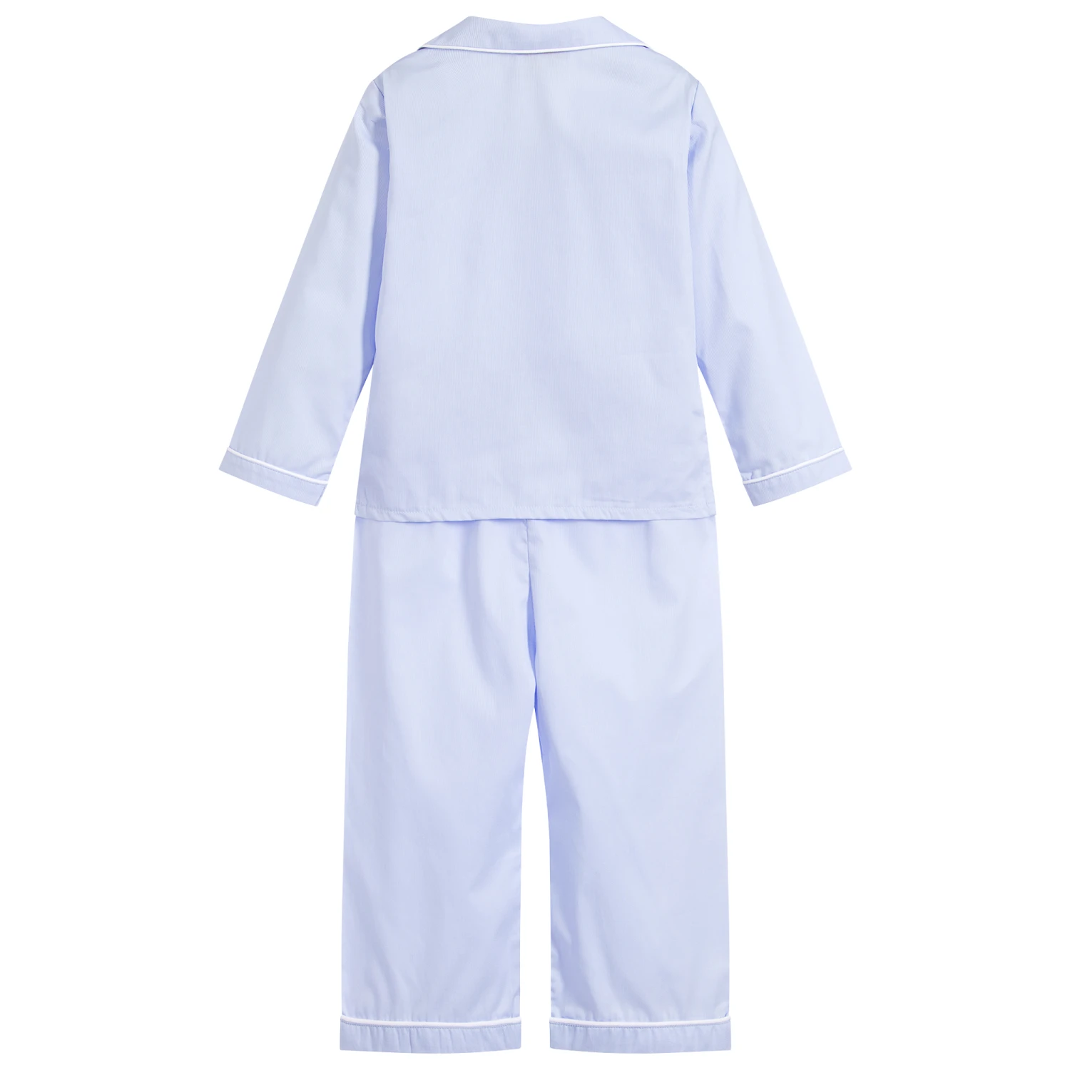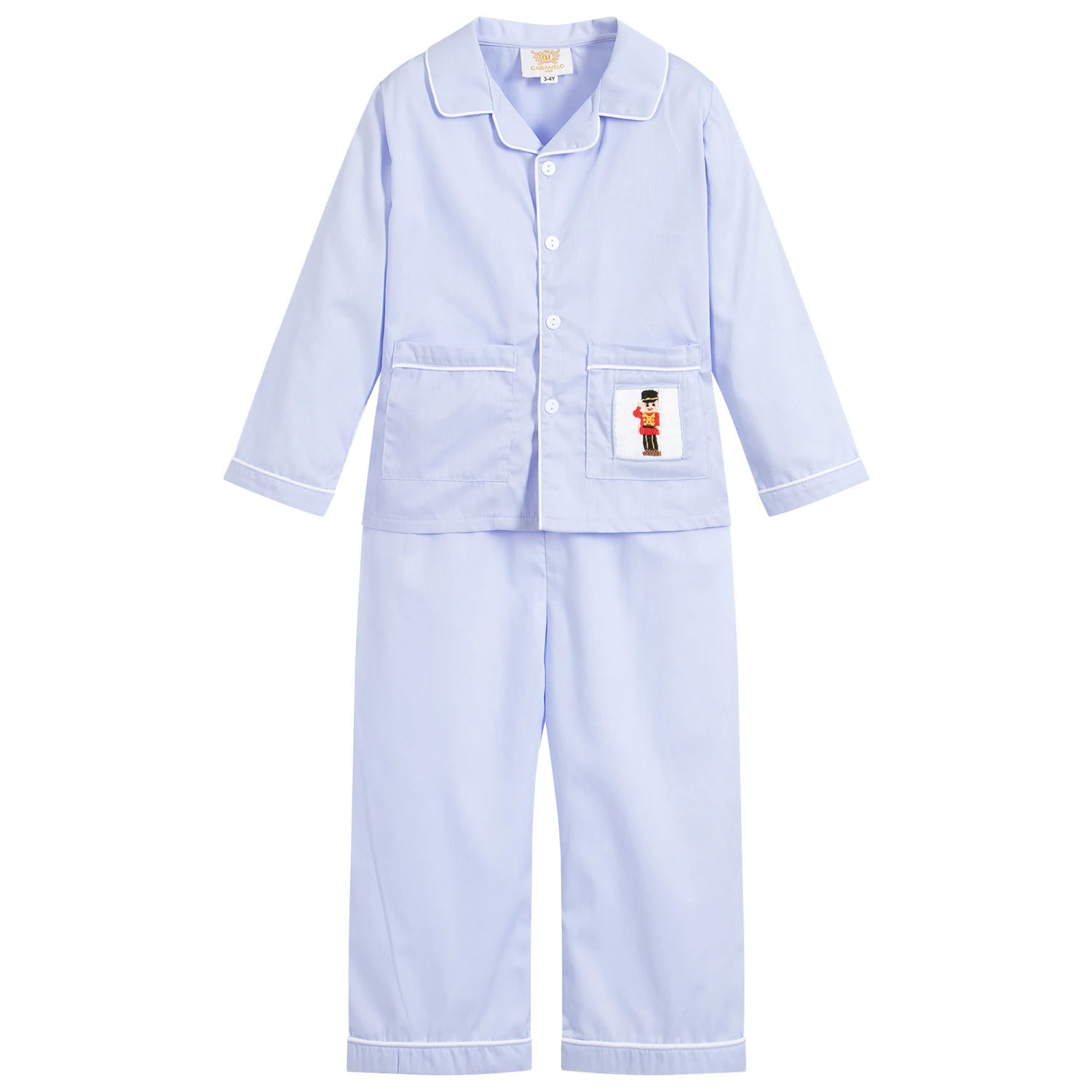 Boys blue pyjamas from Caramelo Kids, made in soft and lightweight cotton. They have a hand-smocked and embroidered soldier on the pocket and white piped trim.