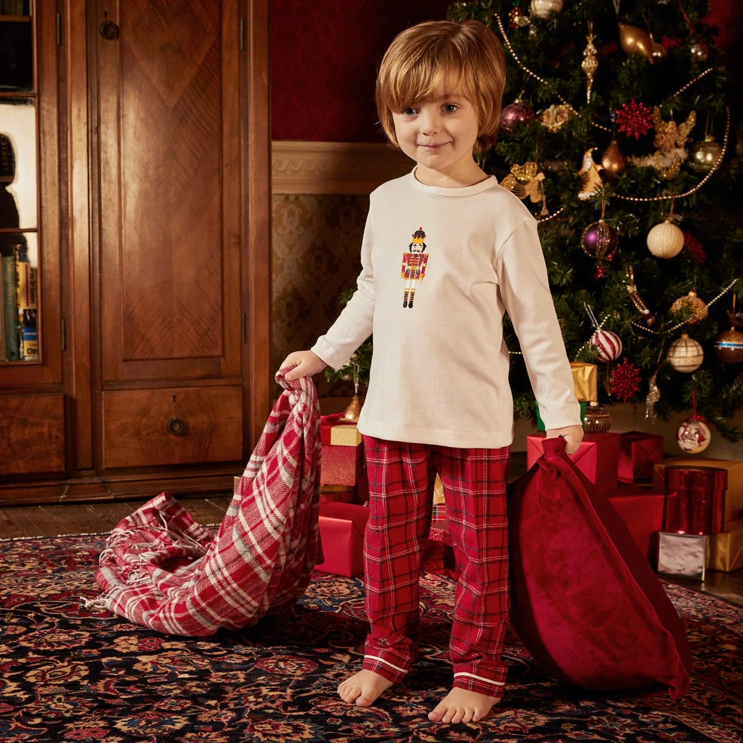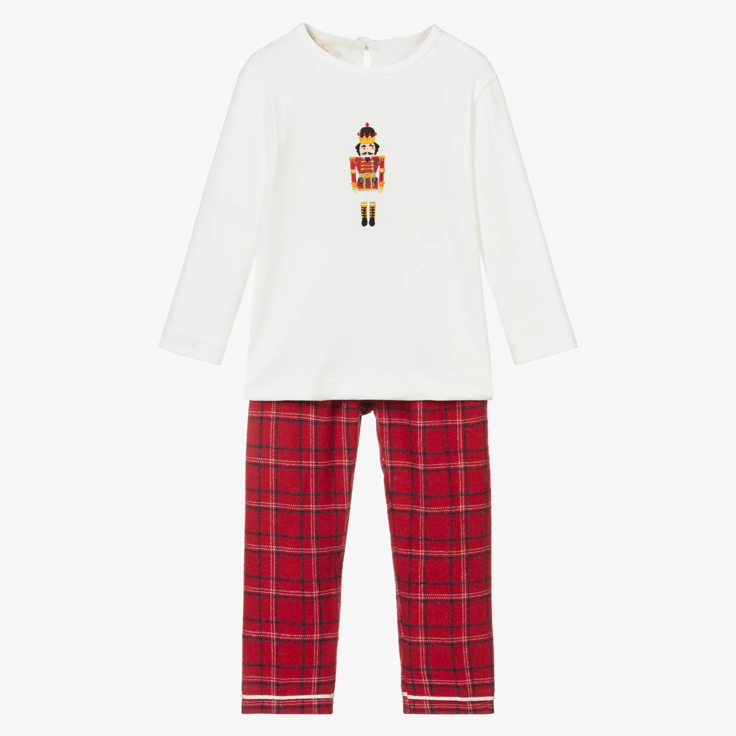 Boys lovely ivory and red tartan pyjamas by Caramelo Kids. A colourful nutcracker soldier is embroidered on the front of the ivory jersey top. The red and blue tartan check trousers are made in soft brushed fabric with an elasticated waist and ivory piping on the cuffs.