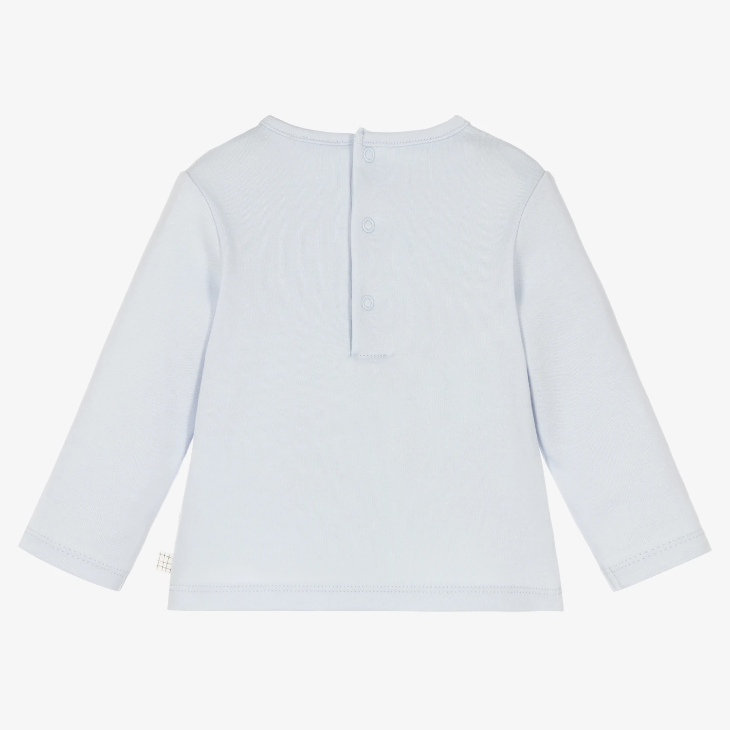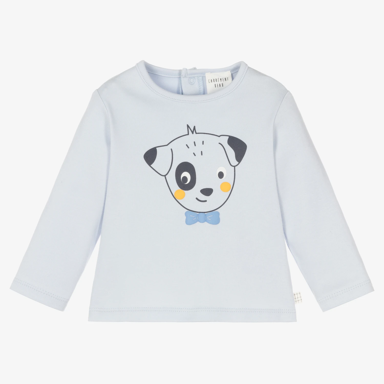 Lovely pale blue top for little boys and girls by Carrément Beau, with a cute dog print on the front. Beautifully soft and comfortable for all-day wear, it is made in organic cotton jersey and fastens easily with poppers on the back.