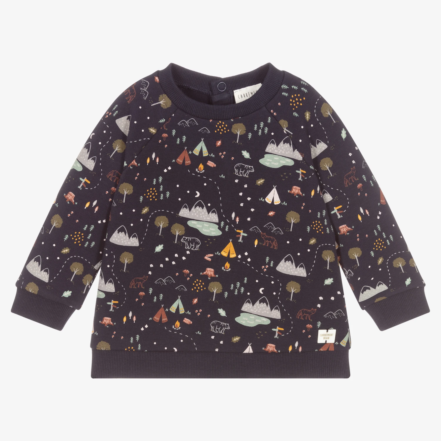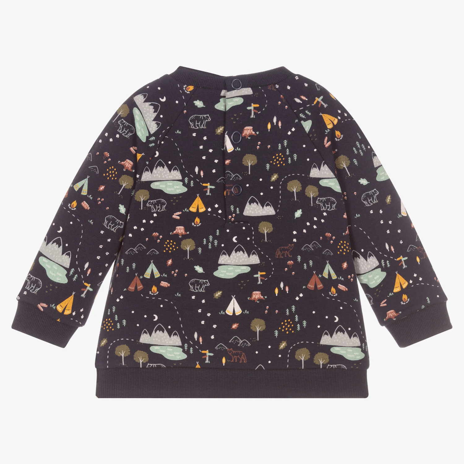 Little boys navy blue sweatshirt from Carrément Beau, made in mid-weight cotton jersey, with a warm, fleecy inside. It has a cute colourful camping print and easy to use popper fastenings on the back.
