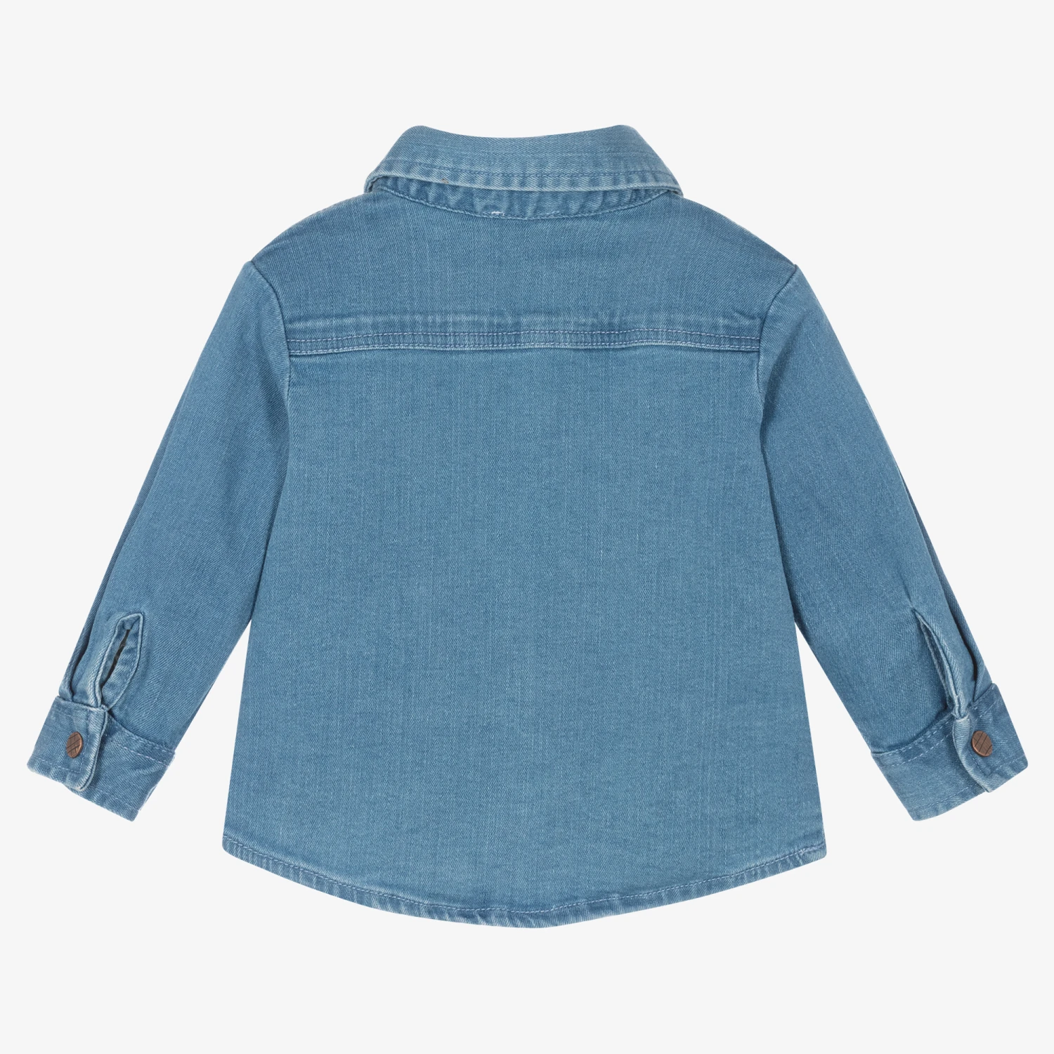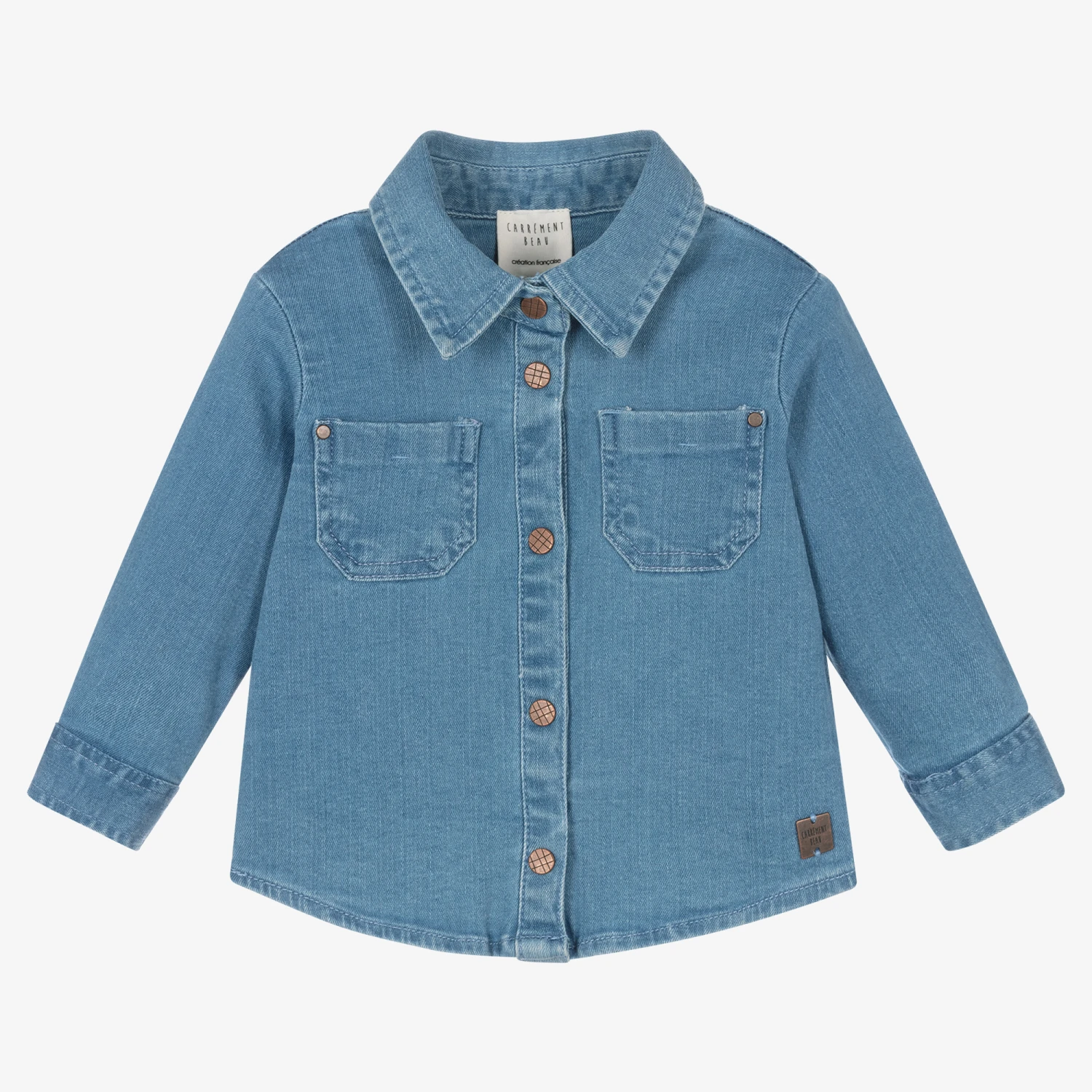 From Carrément Beau, a blue denim shirt for little boys. With retro styling, there are worn-effect bronze pocket rivets and poppers on the front for easy fastening. This medium-weight cotton shirt has a pointed collar, a curved hem, and a bronze logo plate near the front hem.