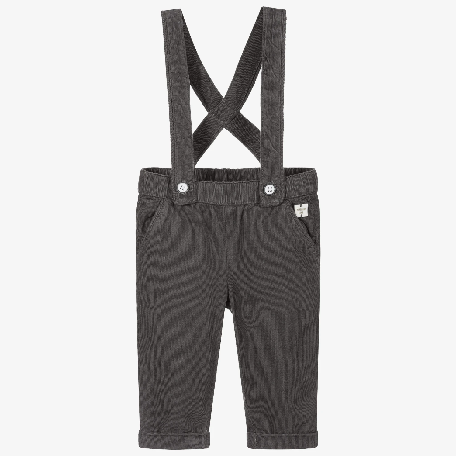 Grey corduroy trousers for younger boys by Carrément Beau, with detachable braces. They have an elasticated waistband, front pockets and stitched turn-ups. The braces fasten with buttons and the brand’s grey and white logo tab is stitched on the front.