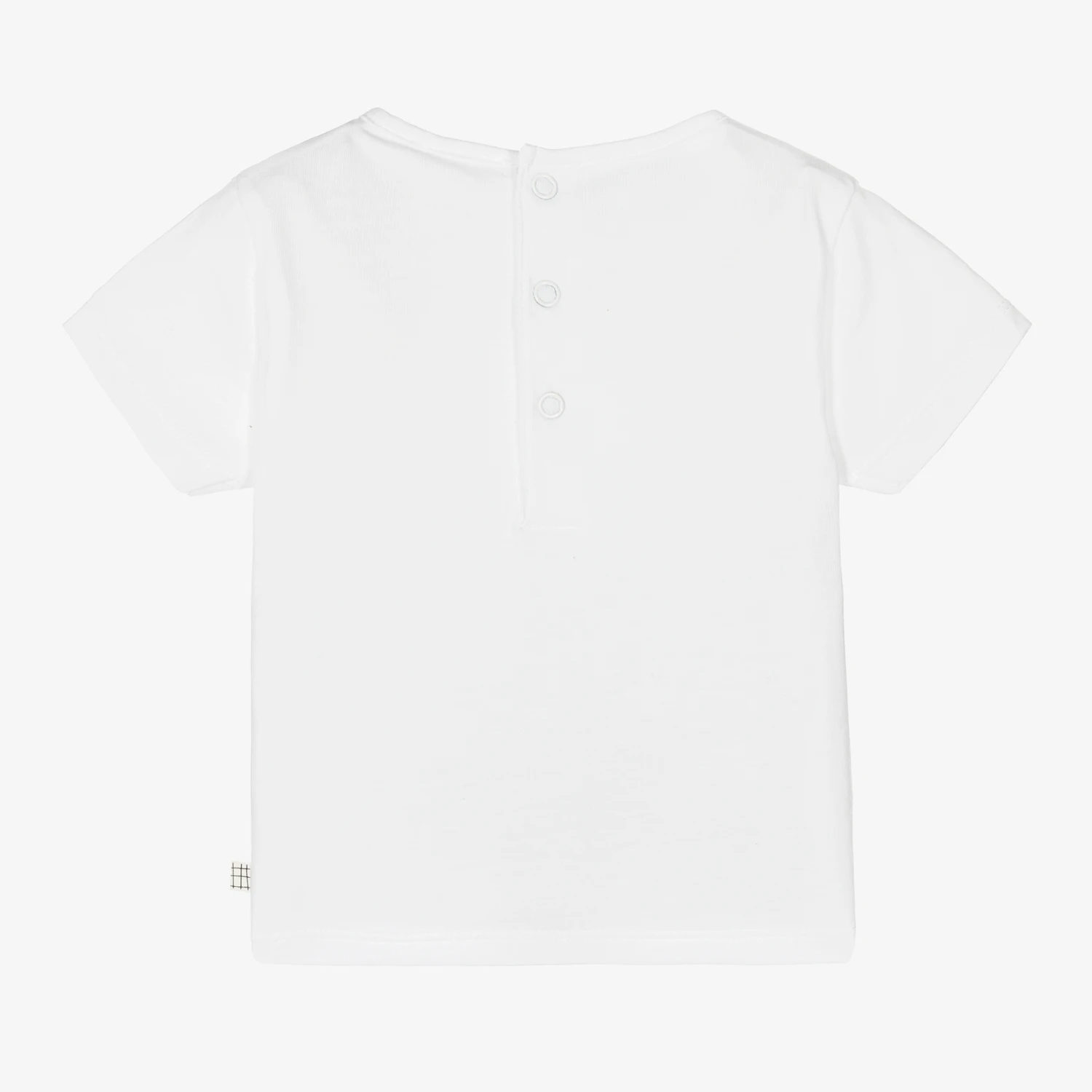 White T-shirt for little boys by French brand Carrément Beau, with a fun chameleon print in green, yellow and blue. Made in comfortable organic cotton jersey, it fastens easily with poppers on the back.
