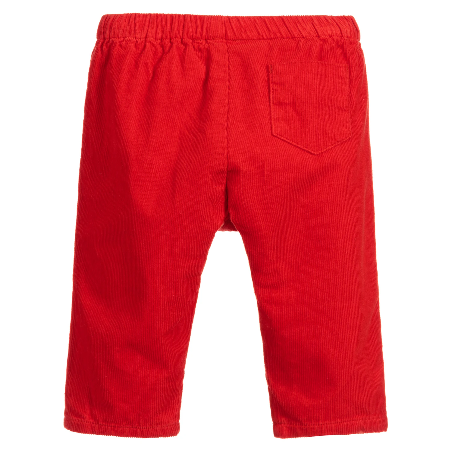 Younger boys and girls red trousers from Carrément Beau. They are made in soft cotton corduroy with a lightweight cotton lining. They have an elasticated waistband, with a blue and white striped faux drawstring.