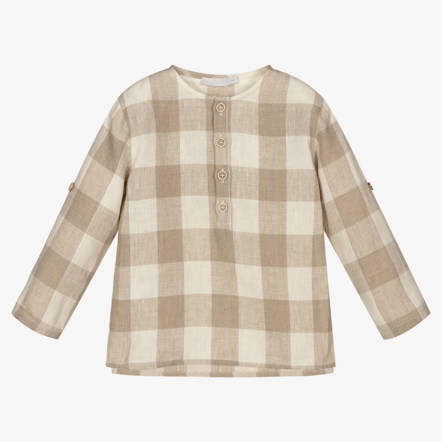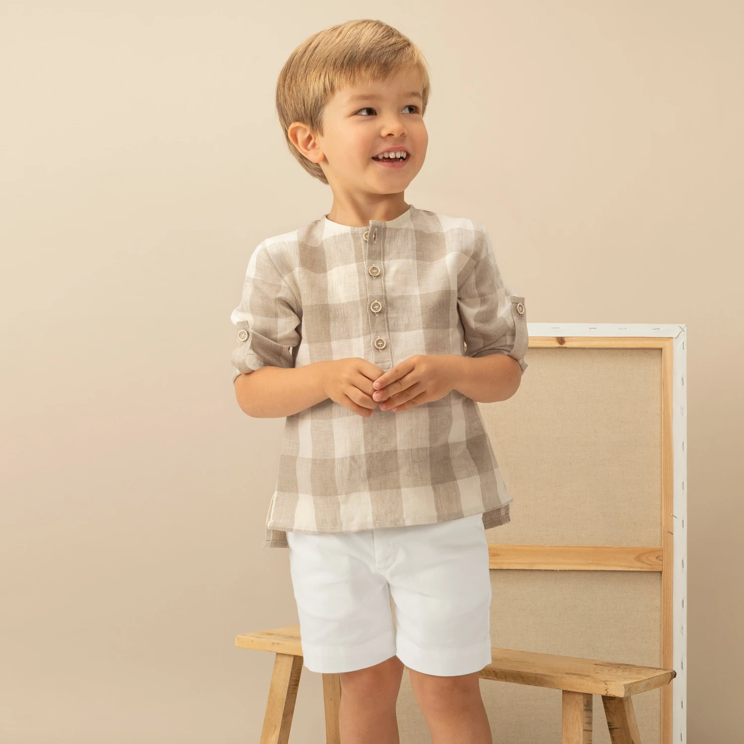 Ivory and beige checked shirt for boys from Chic by Laranjinha. In a collarless style, it is made in cool and comfortable linen. There are upper button fastenings, with button tabs on the sleeves.
