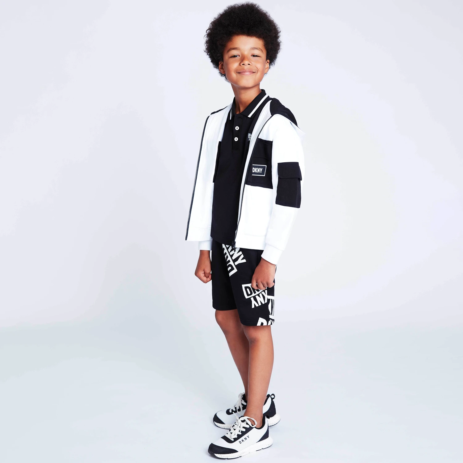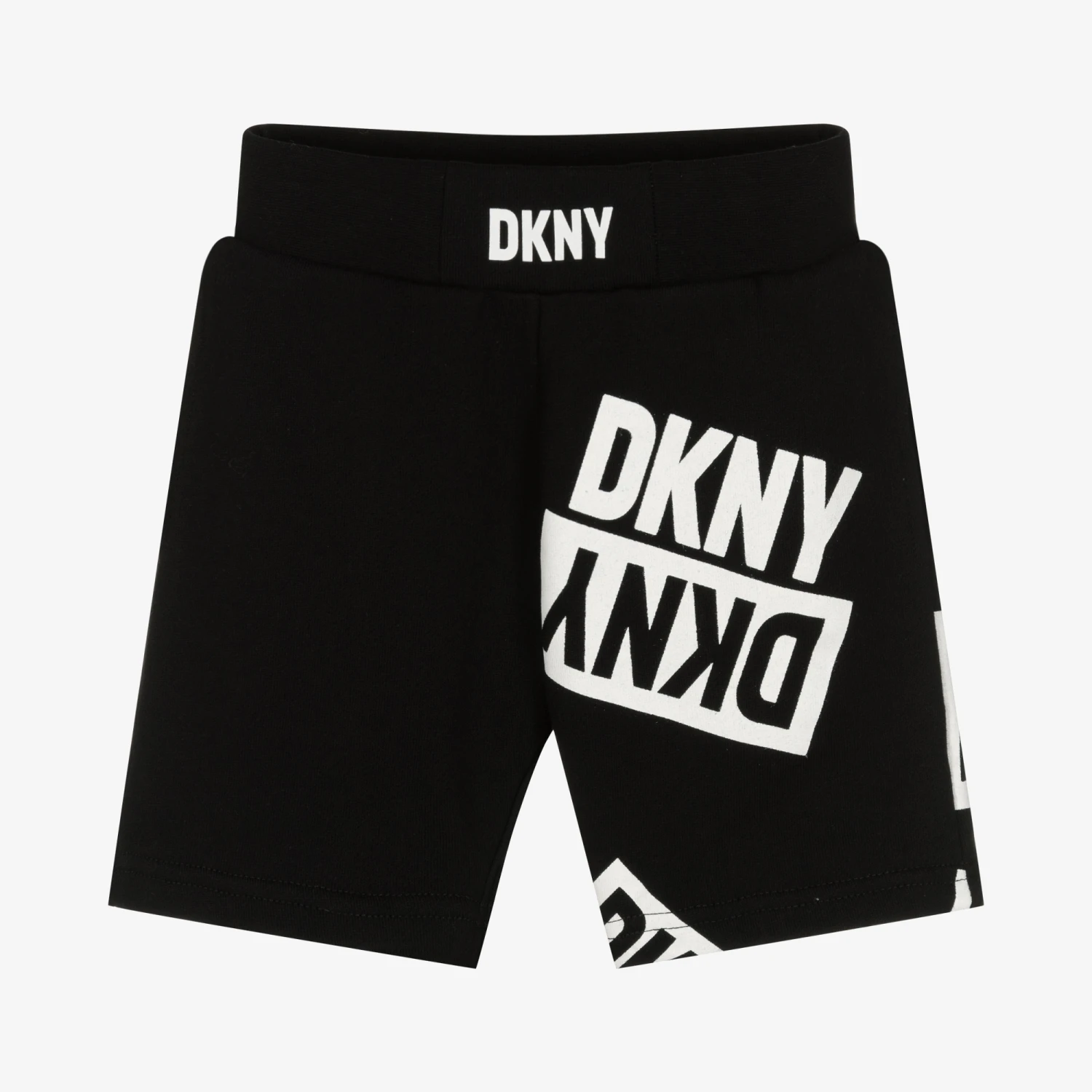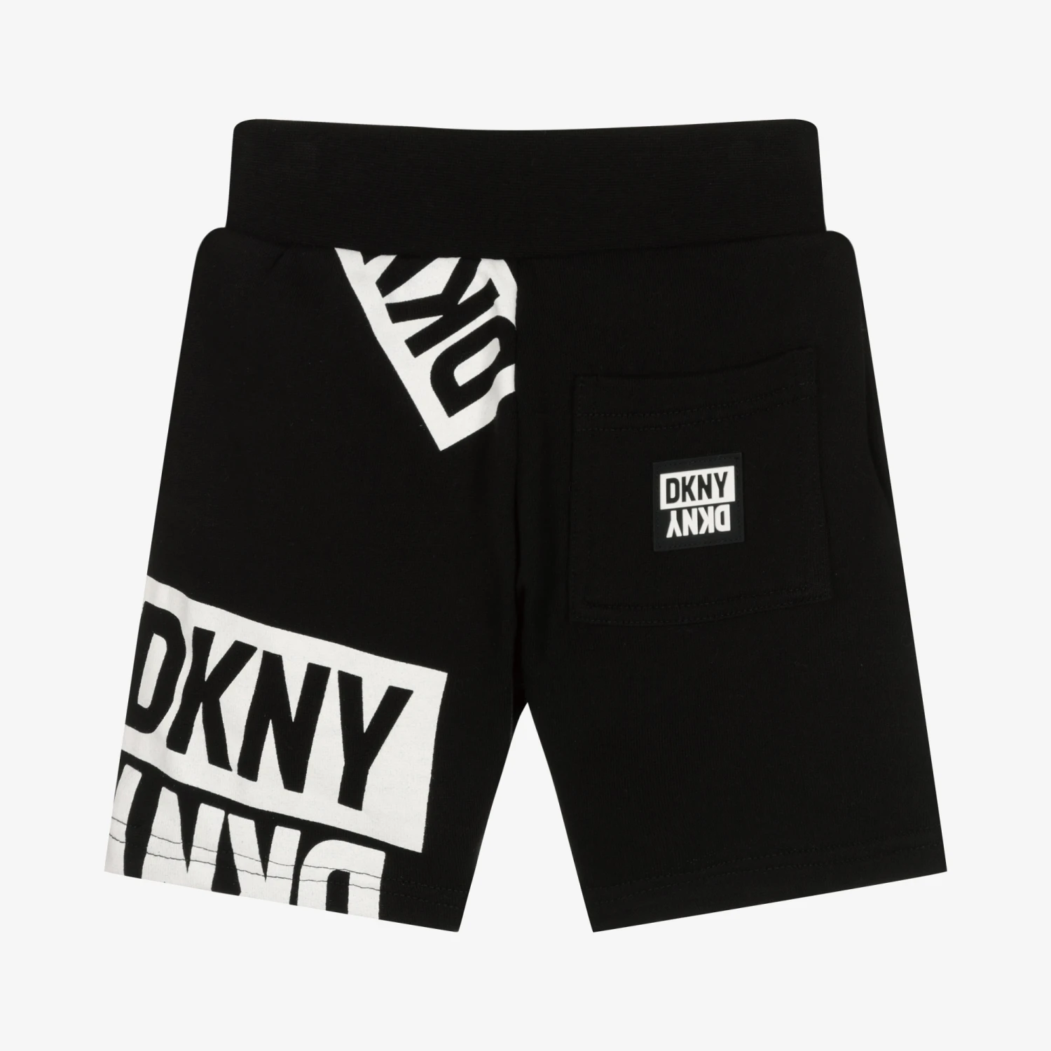 Black cotton jersey shorts for boys and girls by DKNY. Distinctive in style, these easy-wearing bottoms have contrast white box logo prints on the legs and a rubberised logo patch on the back pocket. The classic style includes an elasticated waist and concealed side pockets.