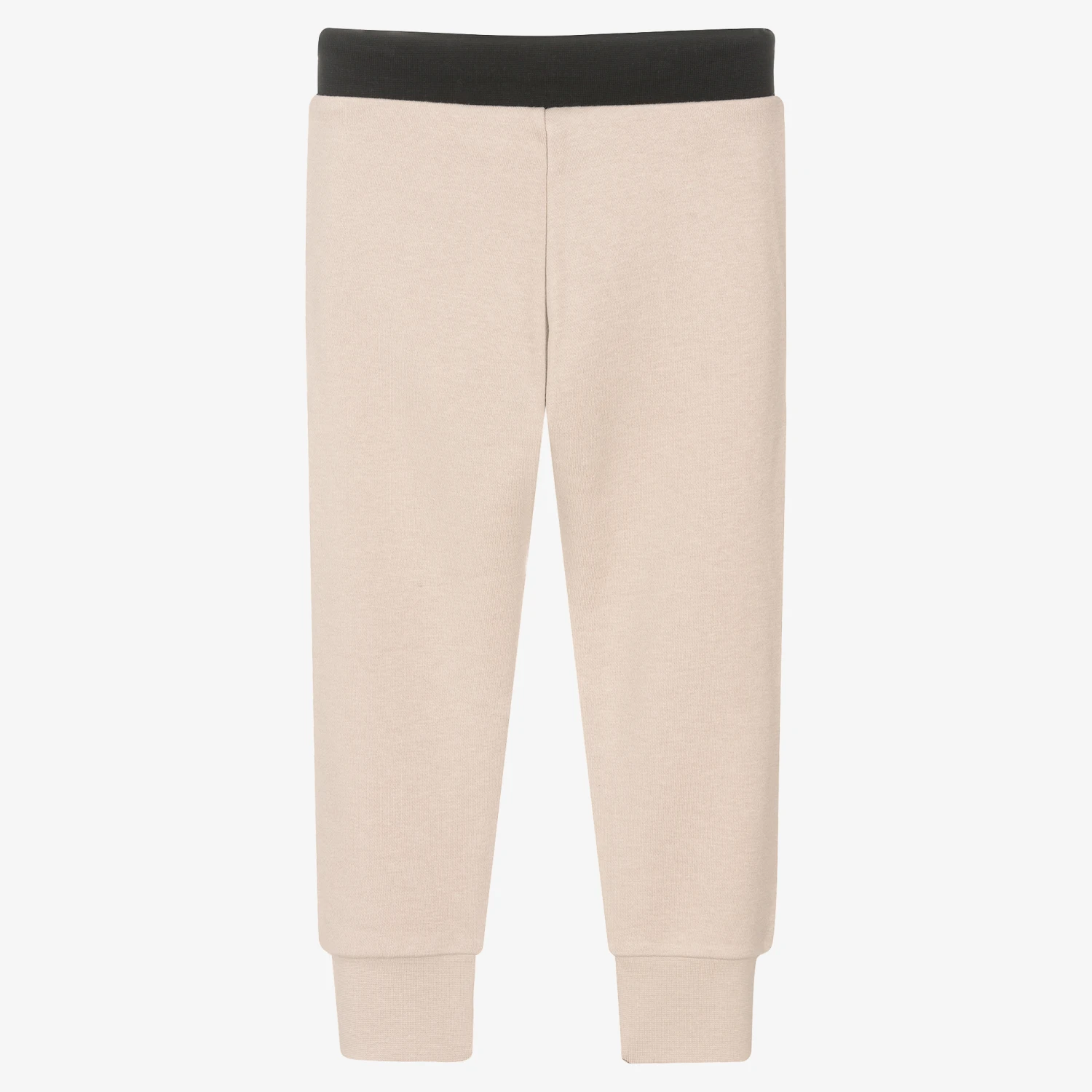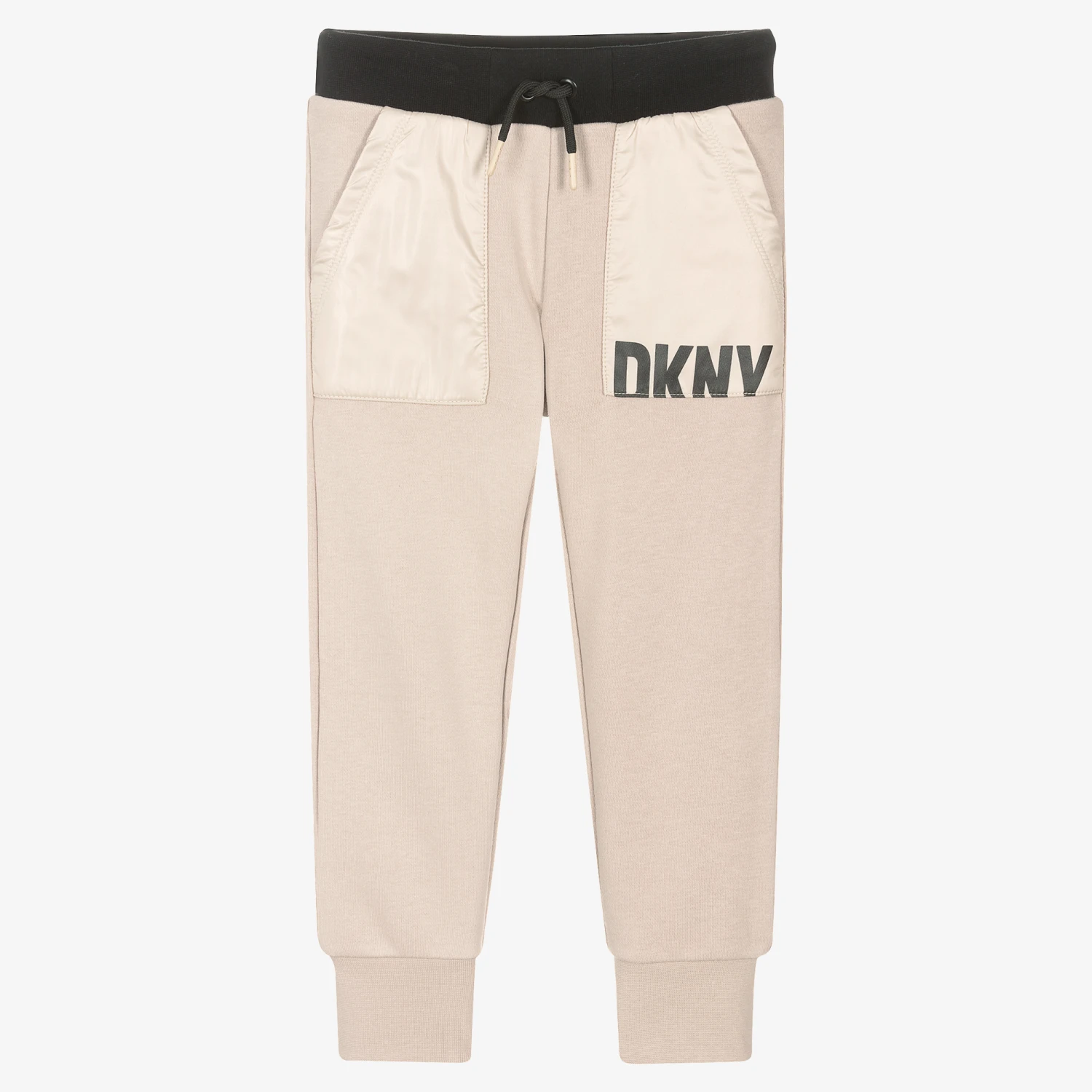 Beige joggers for boys by DKNY, made in mid-weight cotton blend jersey. The casual style has a modern twist with silky pockets on the front, one of which has a black logo print. The elasticated waist has an adjustable drawstring for a better fit.