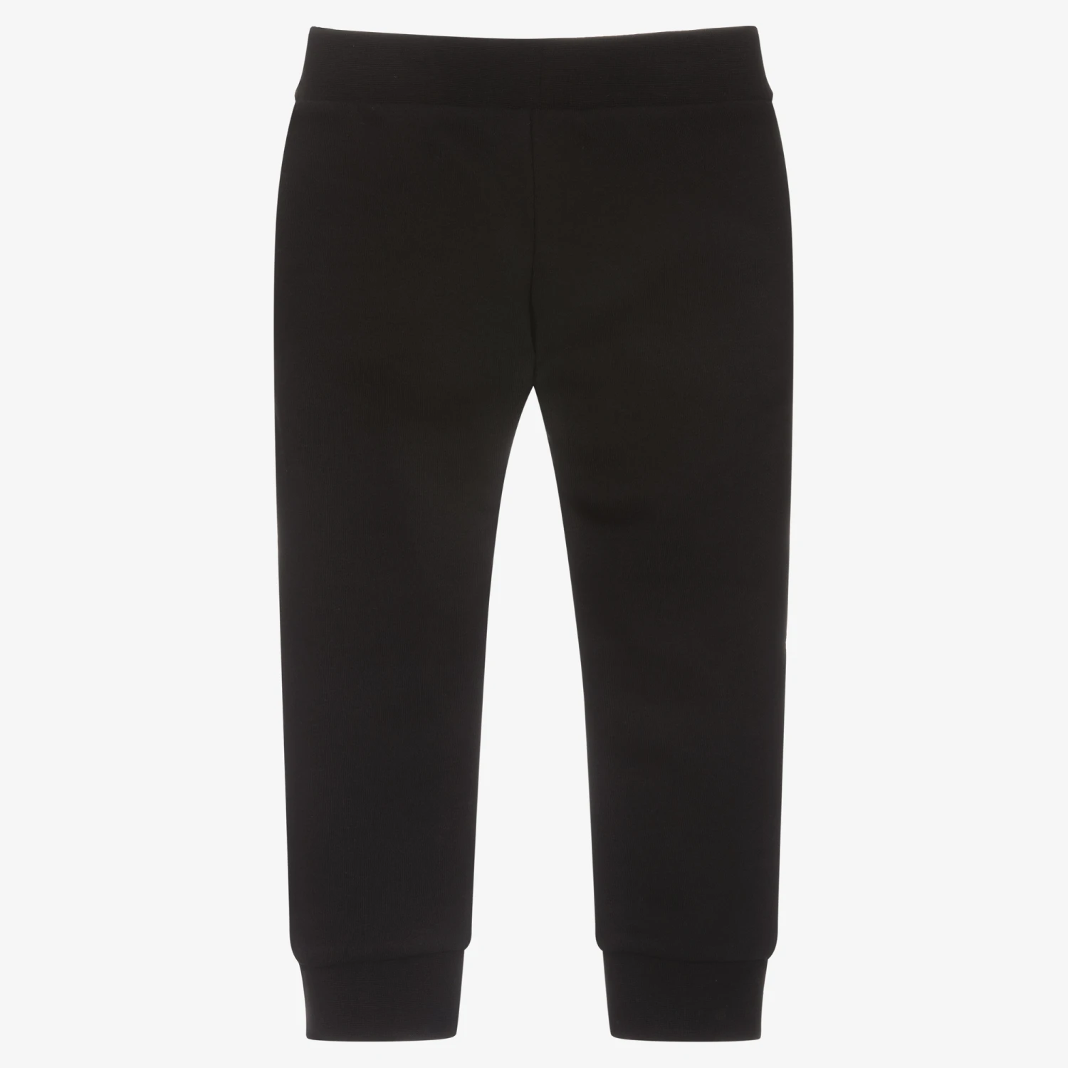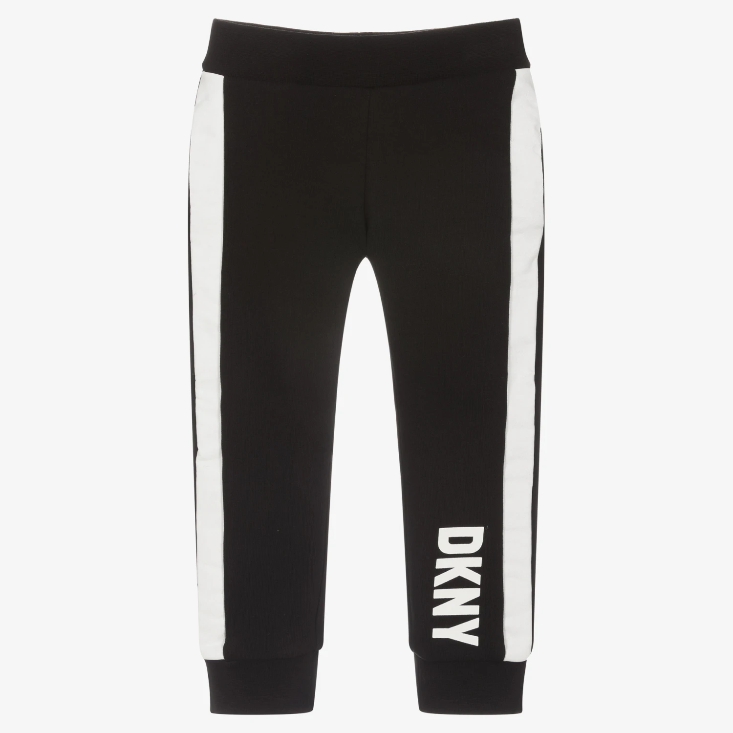 Black cotton joggers for boys by American brand DKNY, made from a mid-weight cotton jersey blend. Sporty in style, they have a white logo print on one leg and white coated trims on the sides of the legs. They have concealed side pockets and an elasticated waist for comfortable wear.