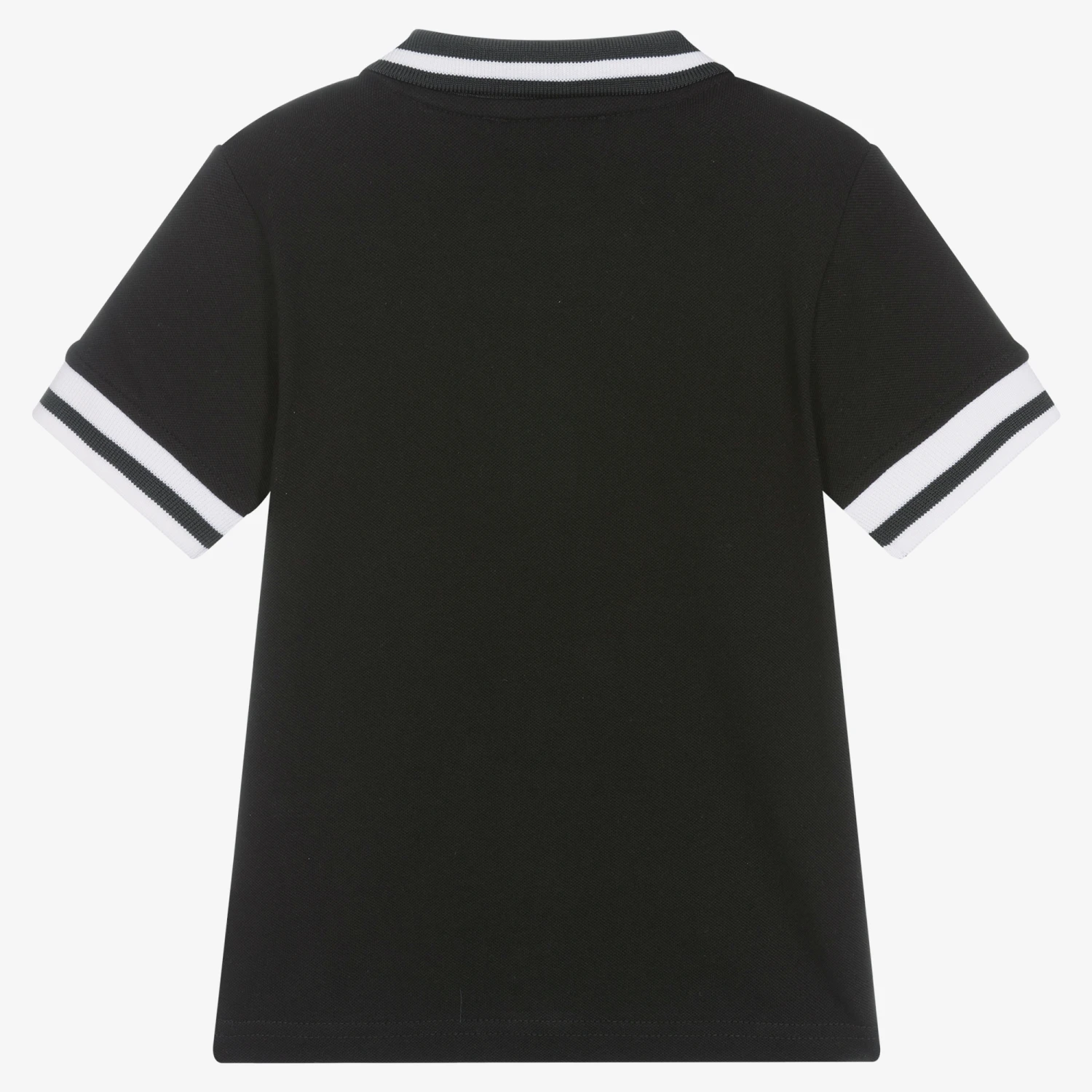 Black cotton polo shirt for boys by American brand DKNY, made in soft, comfortable piqué. It has a black and white rubberised box logo on the front along and white logo trims on the shoulders and sleeves. It fastens with white logo buttons and has ribbed black and white trims.