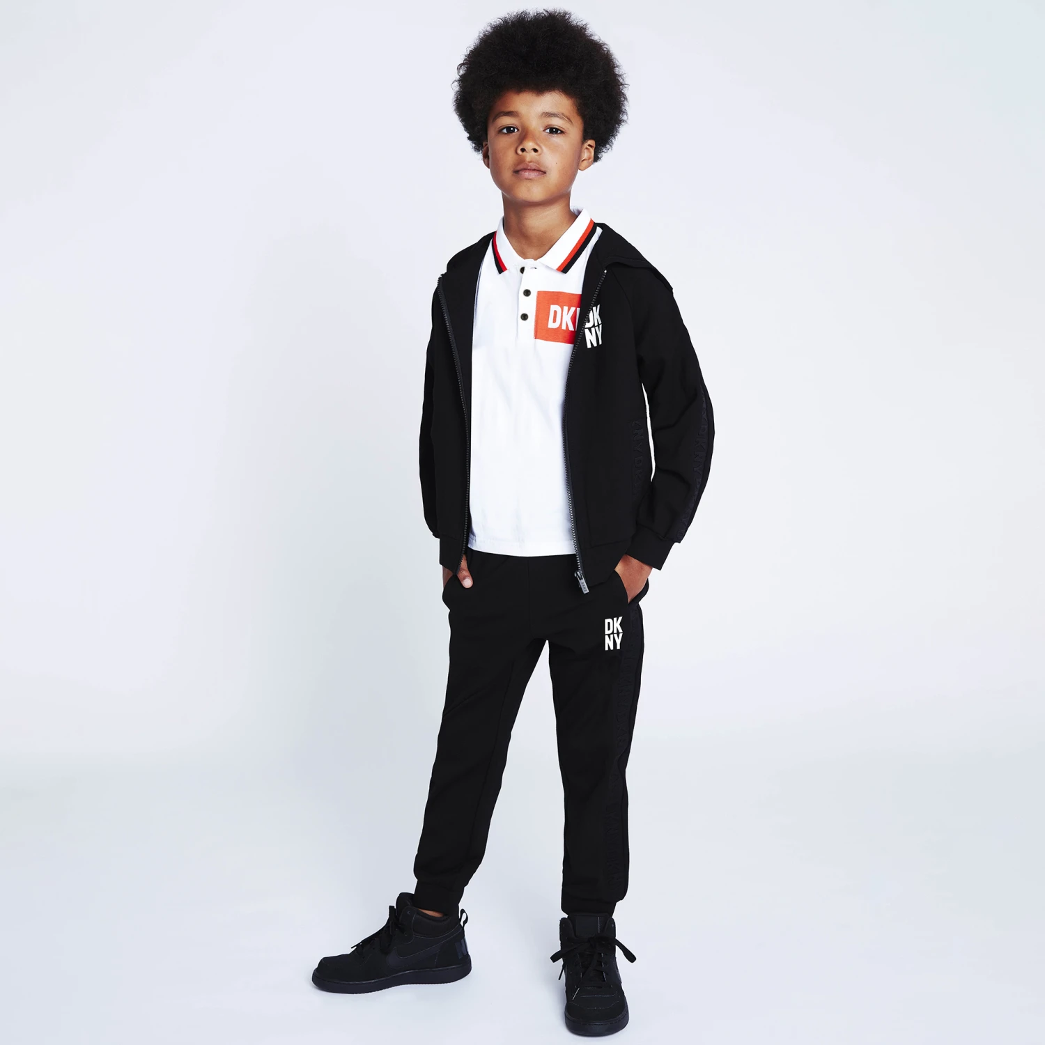 White cotton jersey polo shirt for boys by DKNY. Classically styled with a ribbed collar and button fastenings on the front, red and black trims give an alternative finish. A block red logo print on the chest and a large black logo across the back ensure instant brand recognition.