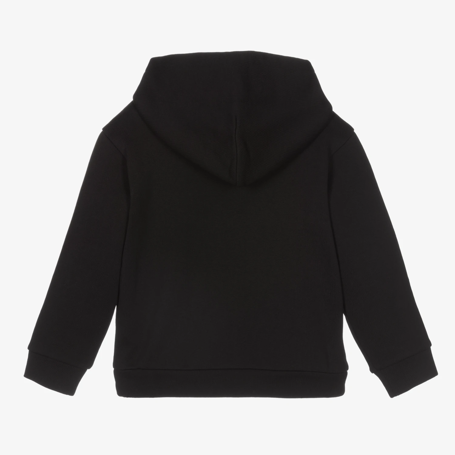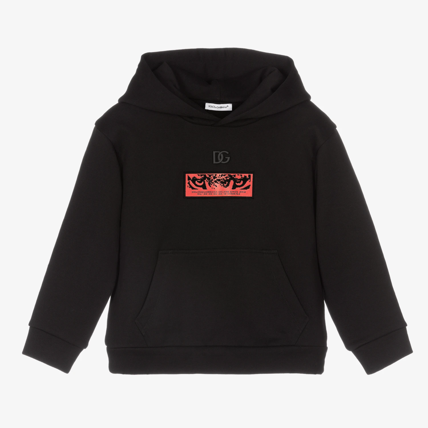 Casual black hoodie for boys, by luxury Italian brand Dolce & Gabbana. Made in soft cotton jersey, it has the brand’s signature crossover DG logo rubberised on the front, a useful front pouch pocket, and a red leopard logo print on the front.