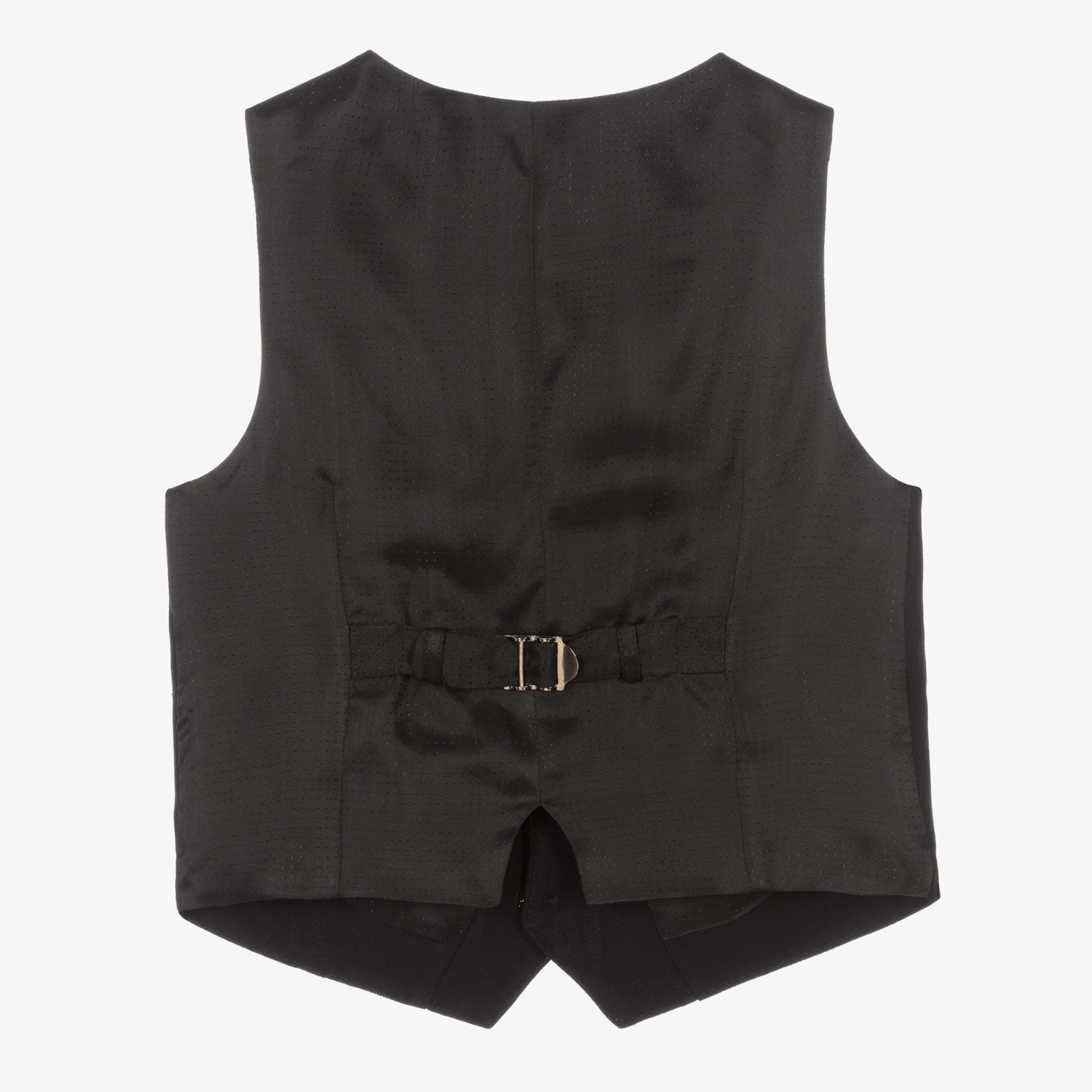 Boys smart black waistcoat by Dolce & Gabbana. Woven in a luxury wool blend, the soft feel fabric has a jacquard crossover DG logo pattern within the weave. There are fabric-covered buttons and faux pockets on the front with silky trims. The back has a silky fabric with a microdot pattern and a metal back adjuster.