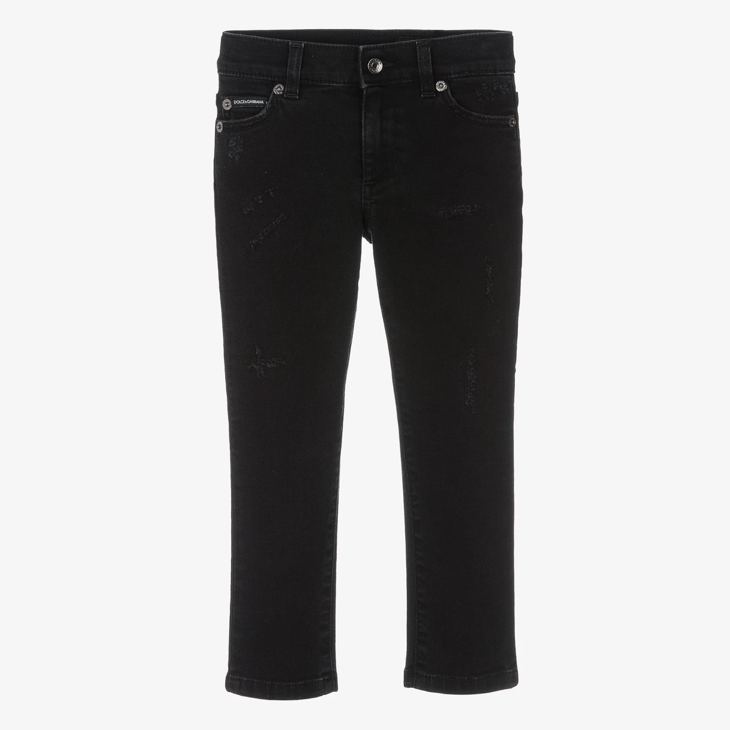 Black slim fit jeans for boys by luxury Italian designer Dolce & Gabbana, made in soft cotton denim with cool, distressed detailing. They have the brand’s black logo tab on the coin pocket and a shiny silver metal logo tab around the back for designer style. They fasten with a logo button and zip on the front, and have a useful, adjustable waistband for a good fit.