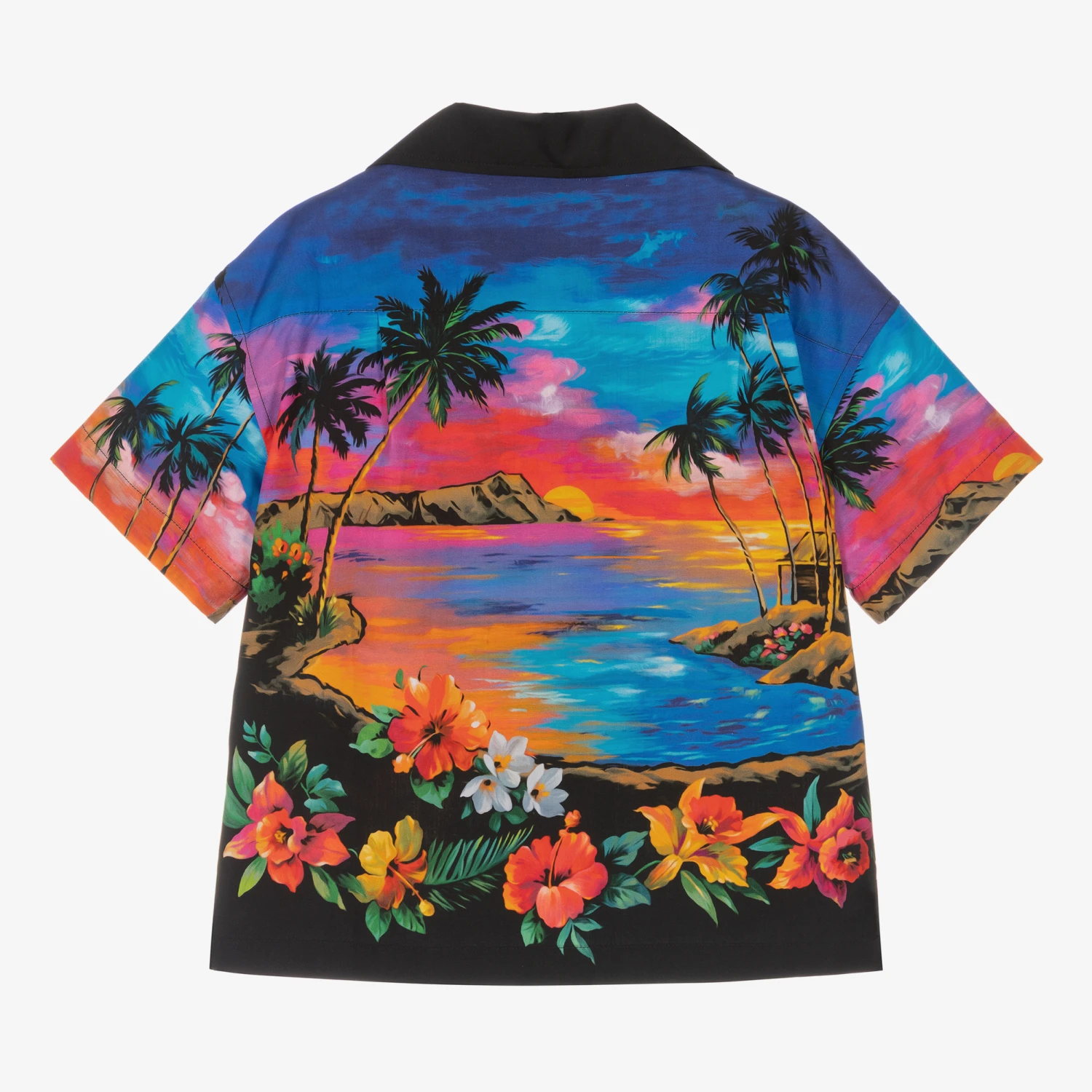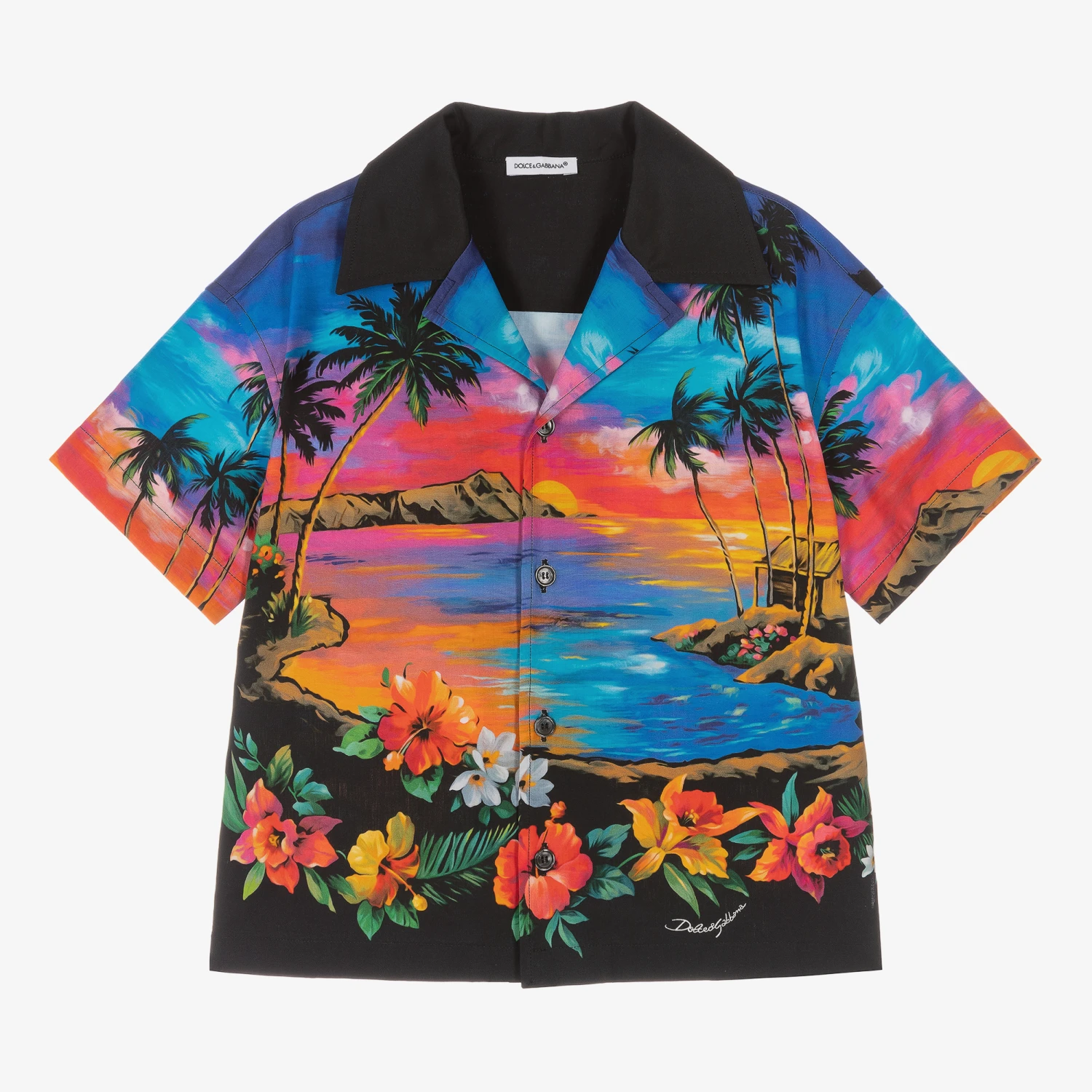 Smart casual black cotton poplin shirt for boys by luxury Italian brand Dolce & Gabbana. Unique and vibrant, the print captures the beautiful Hawaiian landscape and floral, re-imagined in colourful graphics for a seasonal twist. A small white script logo can be seen by the front hem for subtle branding. Luxuriously soft and lightweight, it features a revere collar, button-down front and an oversized fit with dropped shoulders.