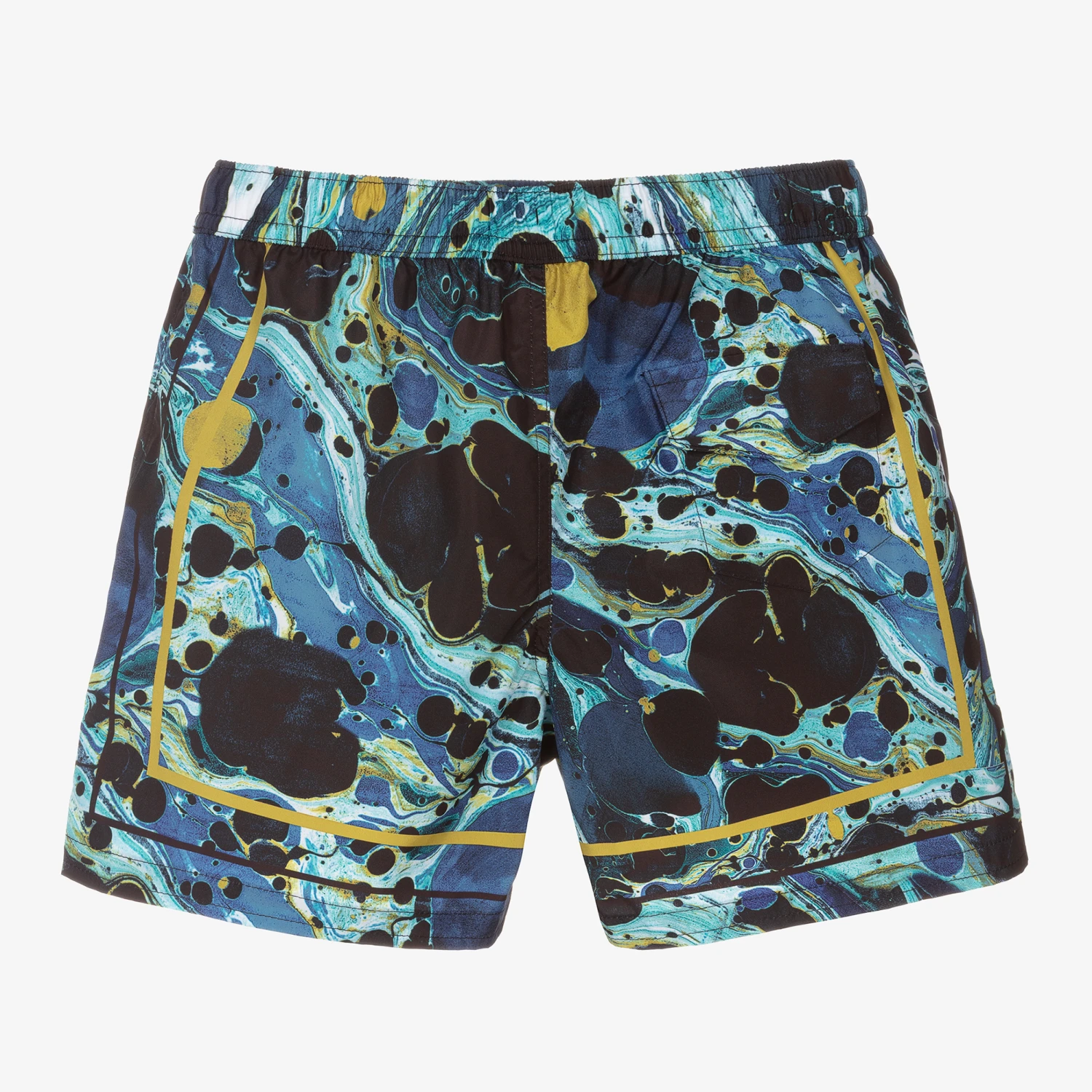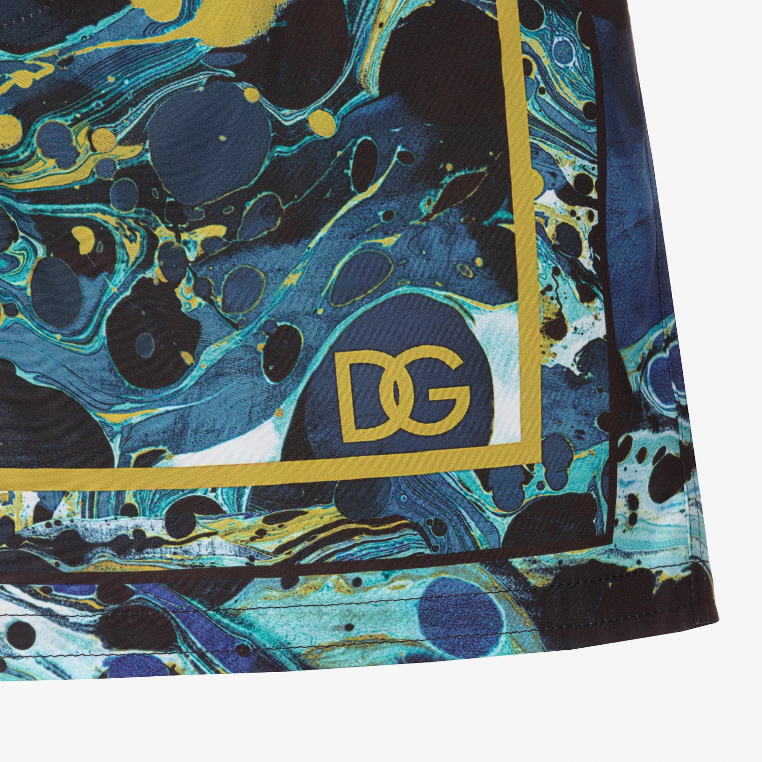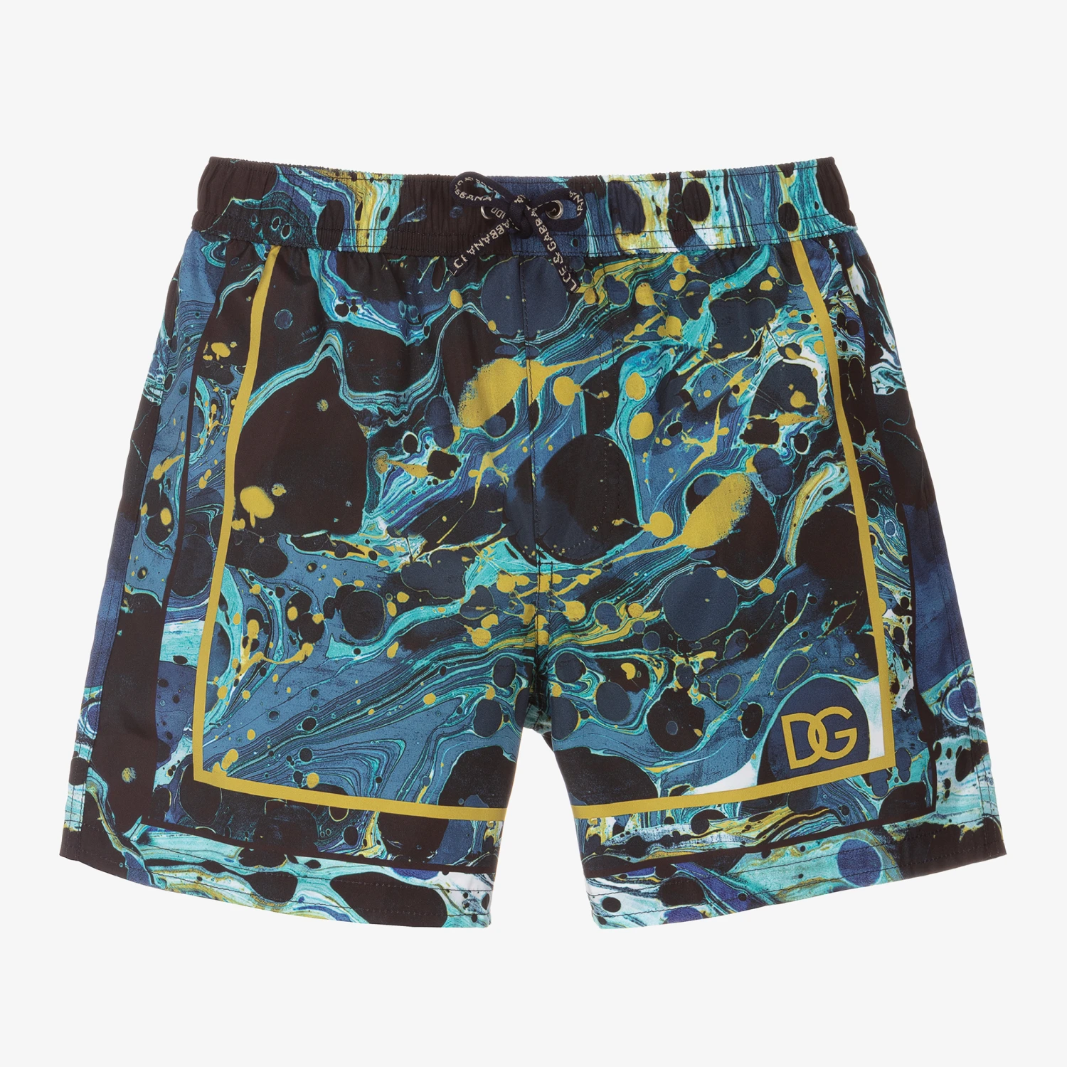 Blue swim shorts for boys by luxury Italian designer Dolce & Gabbana. Soft and silky, there is a beautiful marble print in shades of blue and gold, with the brand’s crossover DG logo. They have a back pocket, a branded drawstring on the elasticated waist and a soft mesh pants lining.