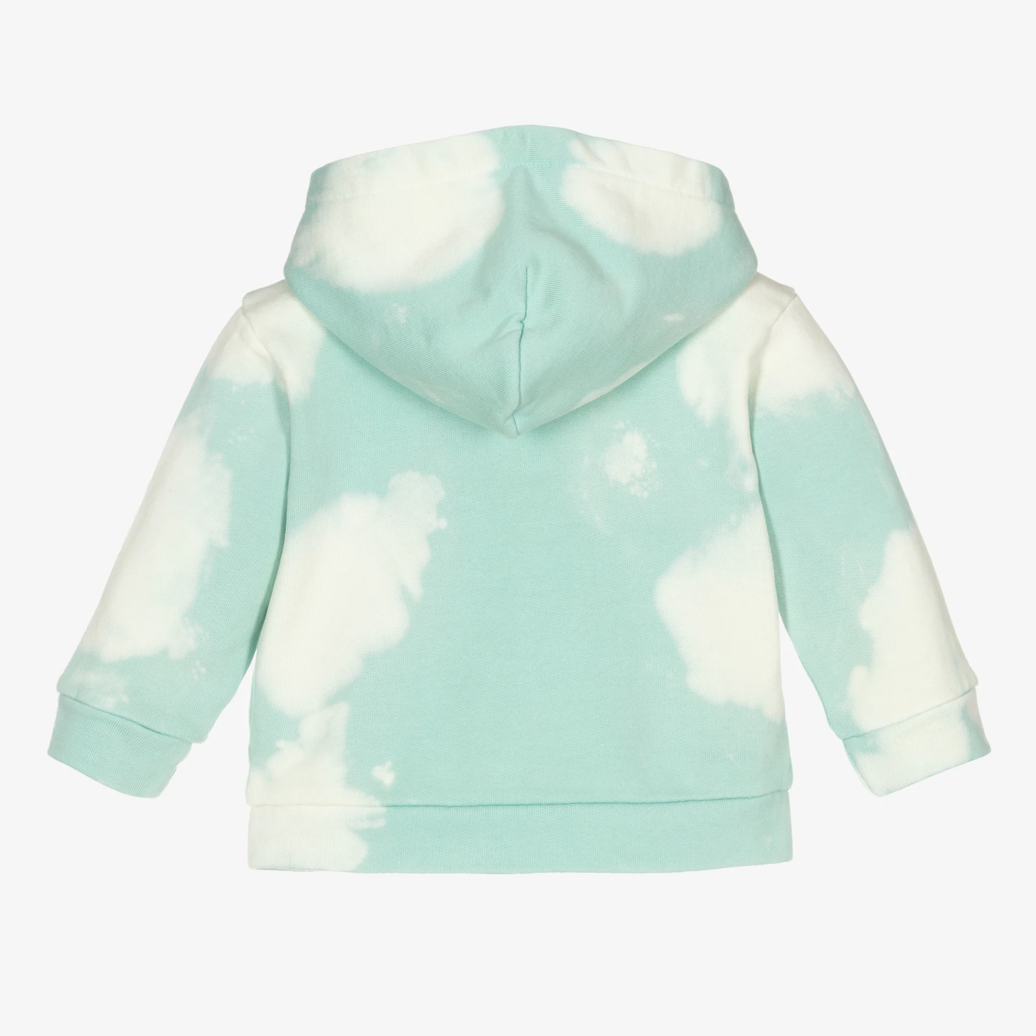 Inspired by the adult collection, turquoise blue and white zip-up hooded top for baby boys, by luxury Italian designer Dolce & Gabbana. Made in soft, mid-weight cotton sweatshirt jersey, it has a cute white all-over cloud design, a sweet orange teddy bear logo print on the front, and little front pouch pockets.