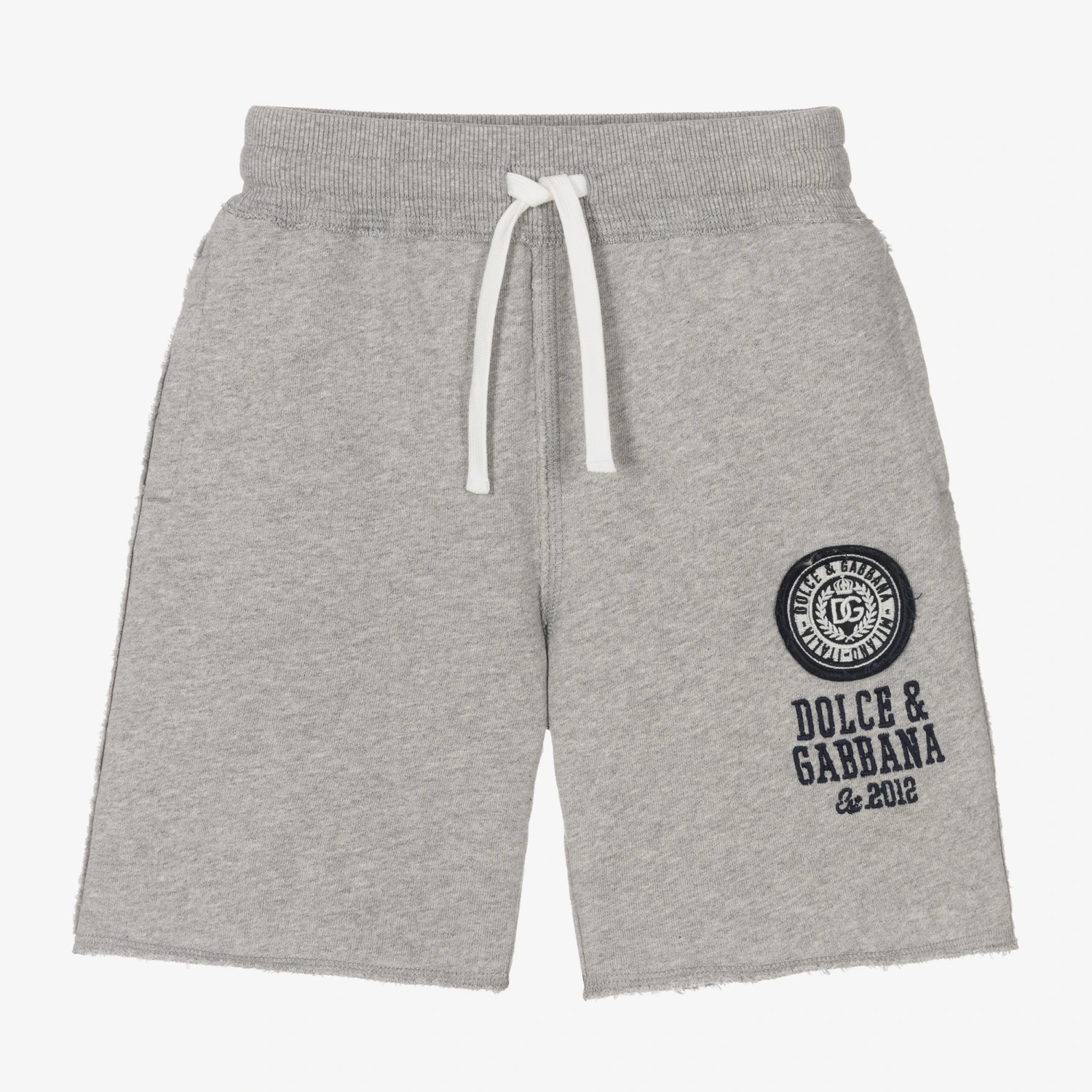 Relaxed grey marl shorts for boys, by luxury designer Dolce & Gabbana. Trimmed with raw edges for an edgy, distressed look, they are made in soft cotton sweatshirt jersey for comfort, and have a varsity-inspired crest appliqué and logo embroidery on one leg. Comfortable and cool, they also have raw, frayed hems for an intentional worn and distressed look.