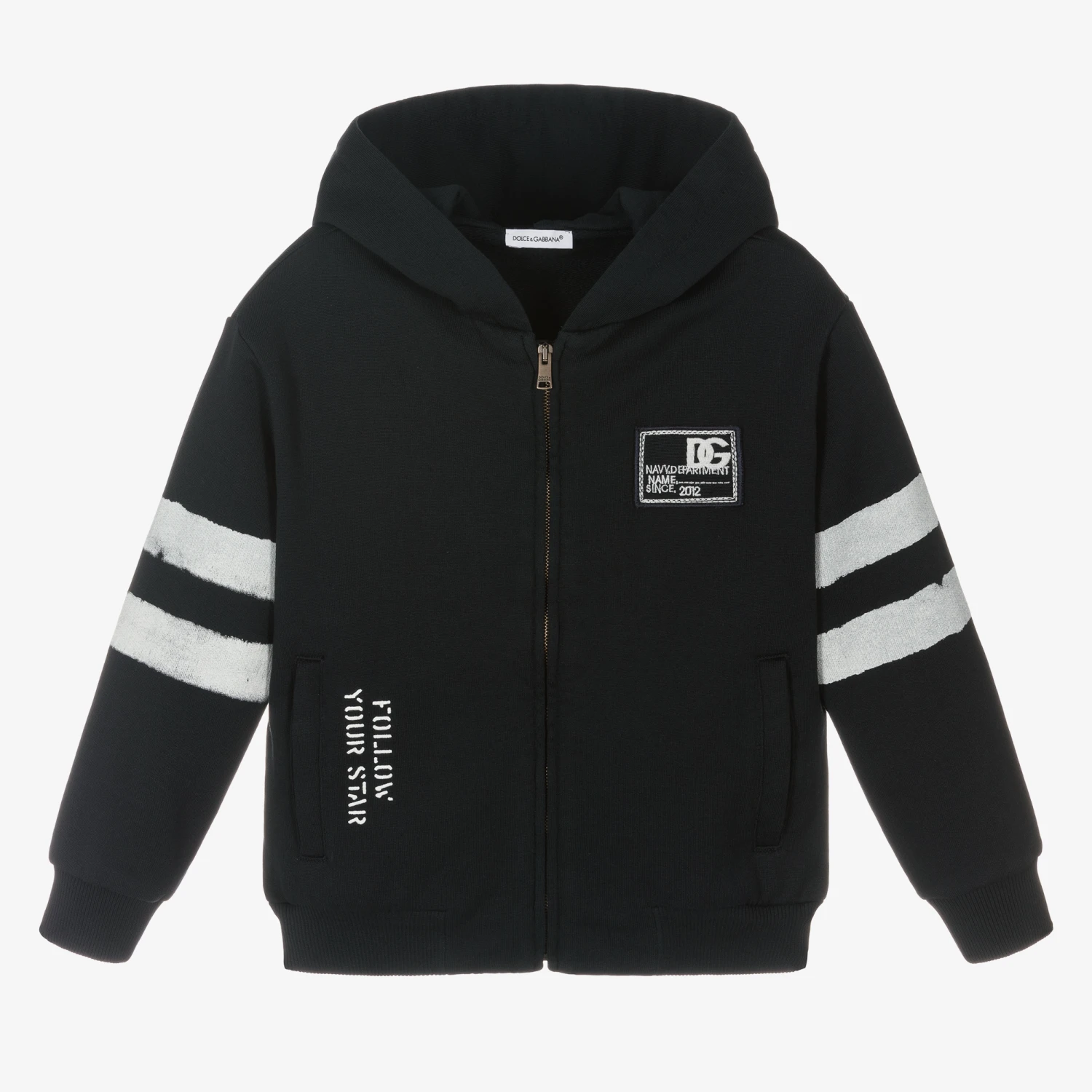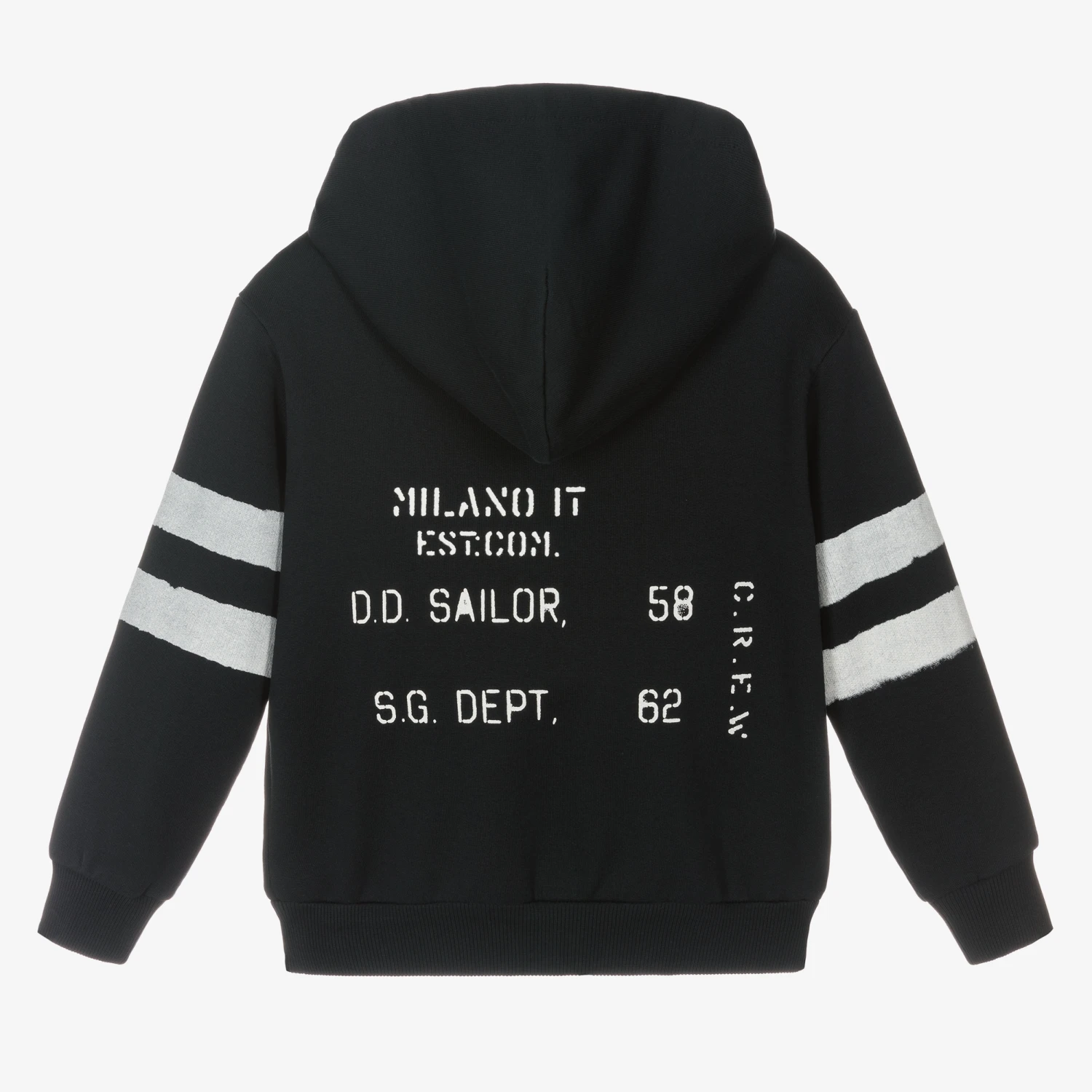 Boys navy blue zip-up hooded top by Italian luxury brand Dolce & Gabbana, made in mid-weight cotton jersey. Taking inspiration from nautical themes, this easy wearing piece has white military style lettering throughout and a crossover DG appliqué on the front. It has white stripes on the sleeves and fastens with a bronze logo zip, for a final branded finish.