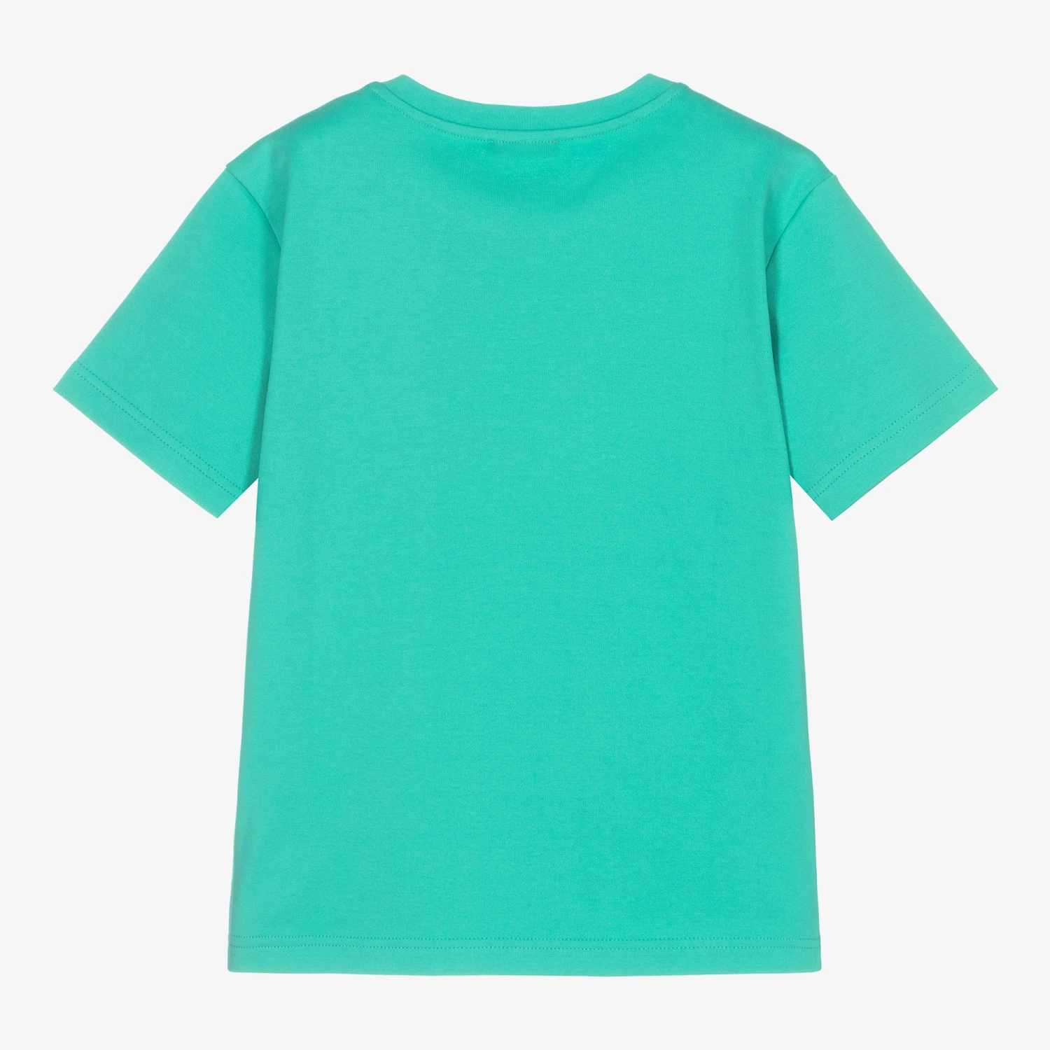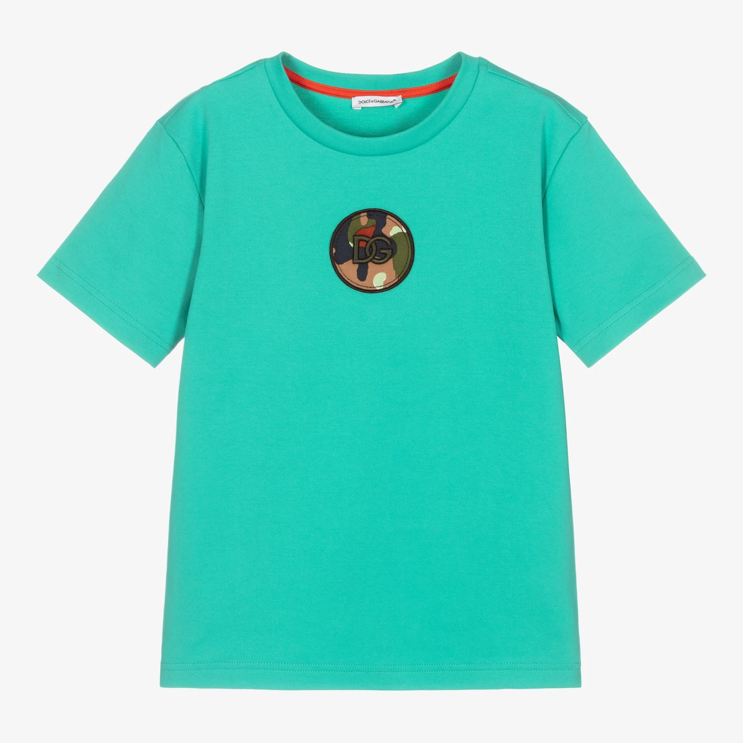 Classic turquoise blue T-shirt for boys by luxury Italian designer Dolce & Gabbana. Made in soft cotton jersey, it has a brown and green camouflage appliqué on the chest, with a crossover DG logo.