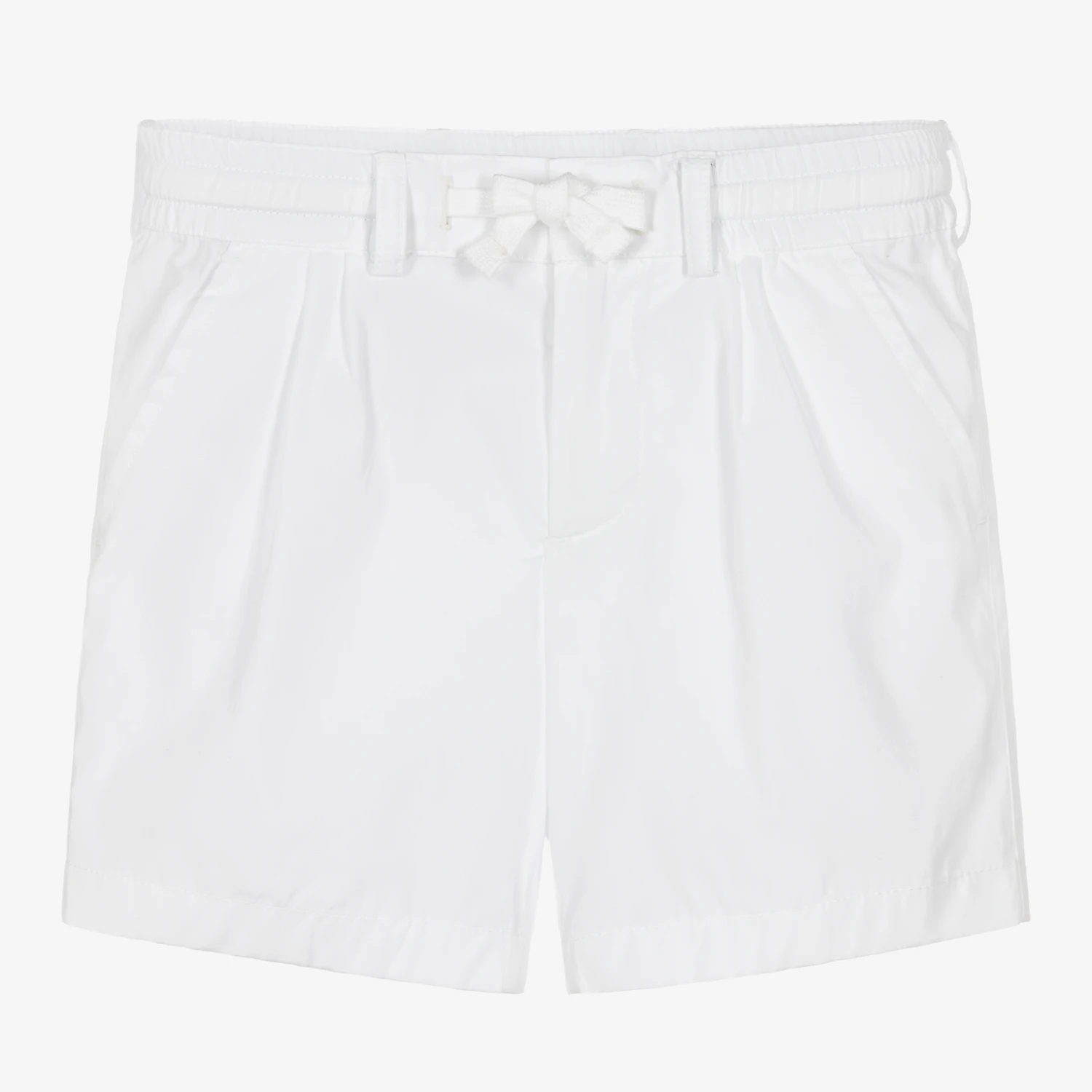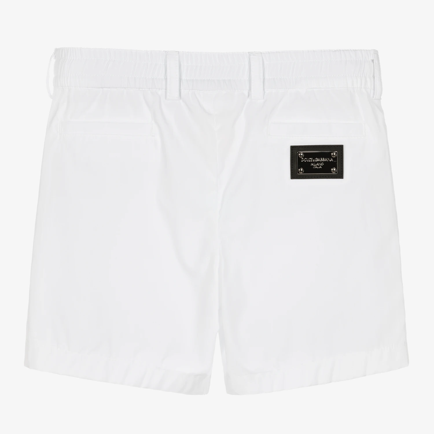 Designed by luxury Italian label Dolce & Gabbana, these white Bermuda shorts are made for little boys. Made in soft, smooth cotton, they have subtle slanted pockets on the sides and a silver logo plaque on the back for instant designer appeal. Fastening with a button and zip on the front, the drawstring detail on the waist keeps these smart shorts up-to-date with a contemporary twist.