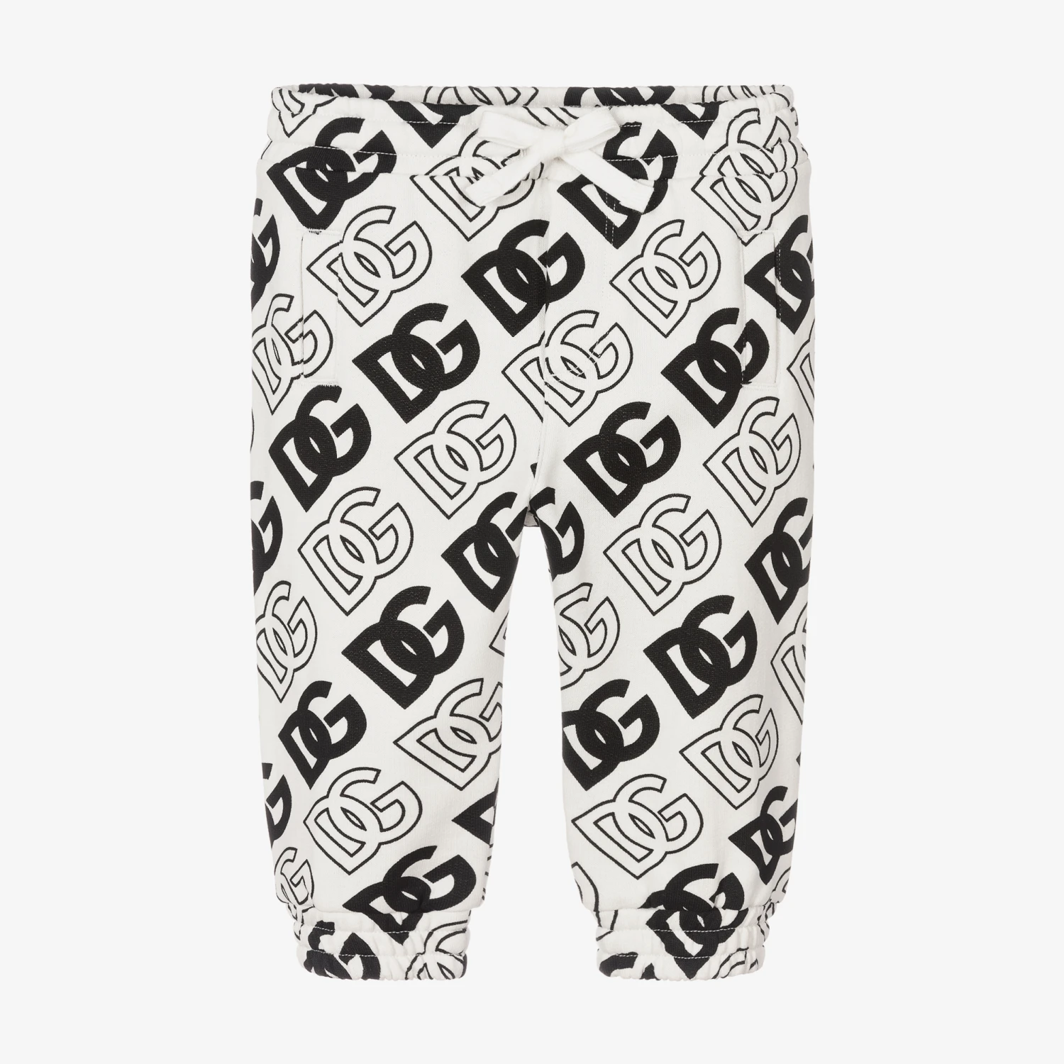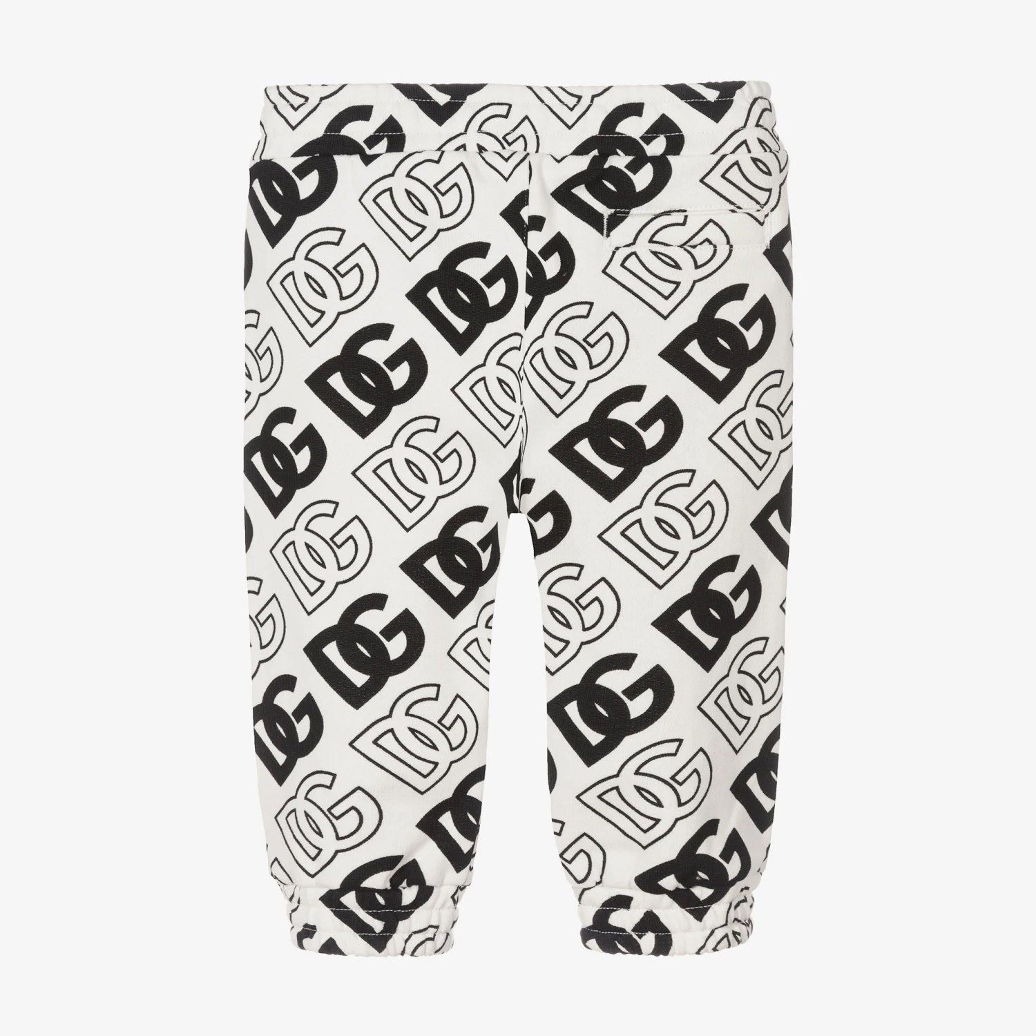 Younger boys monochrome joggers by Dolce & Gabbana. Made in mid-weight cotton sweatshirt jersey, the white fabric has an all-over black and white DG cross-over logo print. They have an adjustable drawstring waistband, faux pockets and elasticated cuffs.