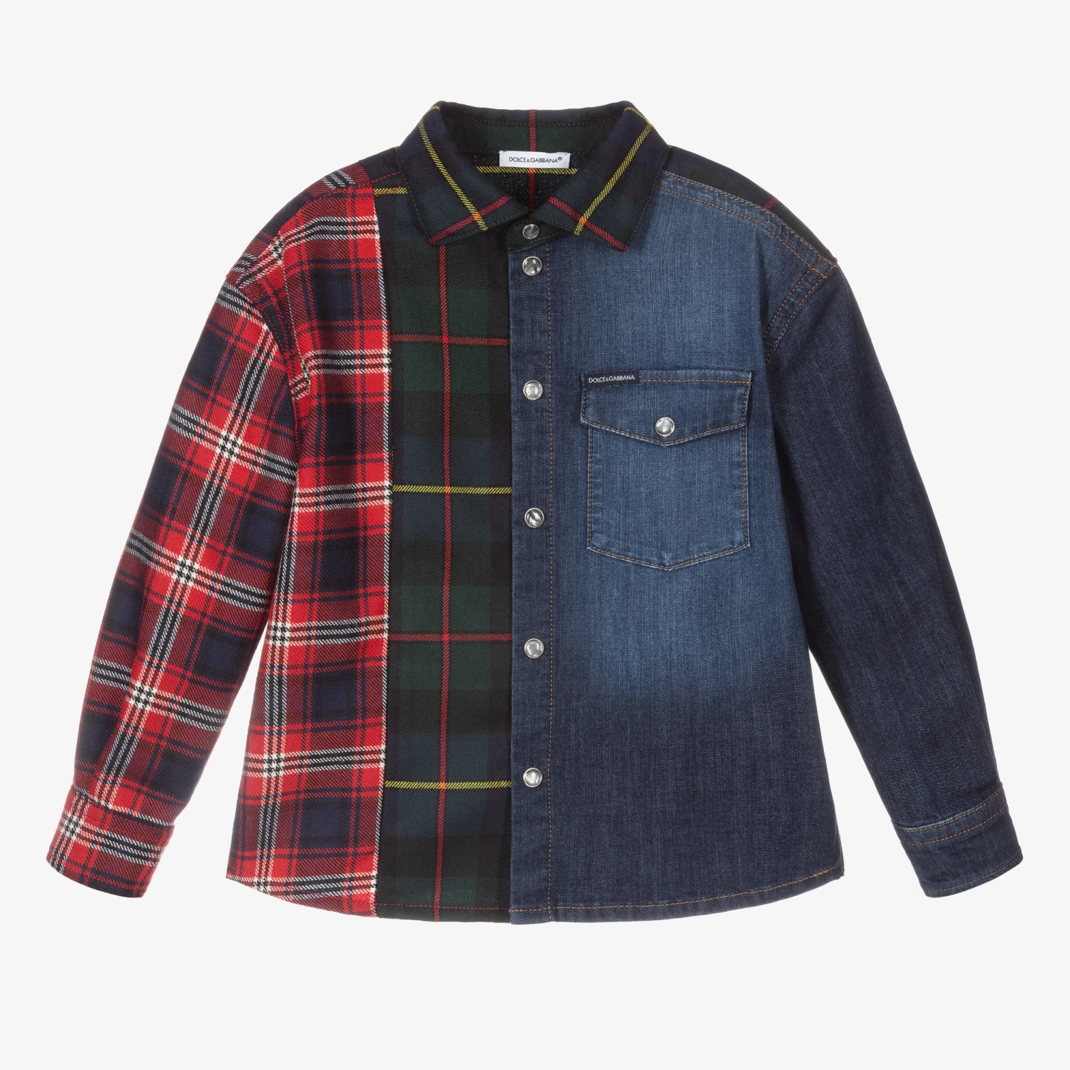 Boys red tartan check and blue denim shirt from luxury designer Dolce & Gabbana. It is made in a combination of soft wool twill and lightweight denim. There are popper fastenings on the front and a logo tab on the chest pocket.