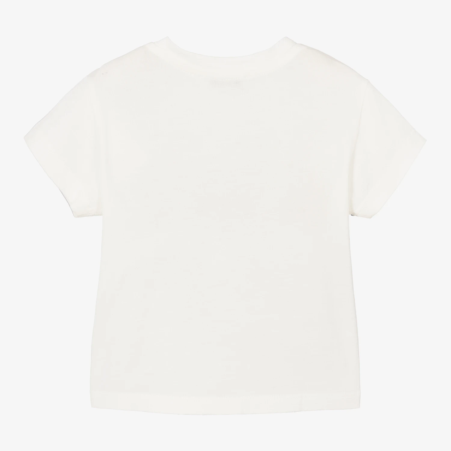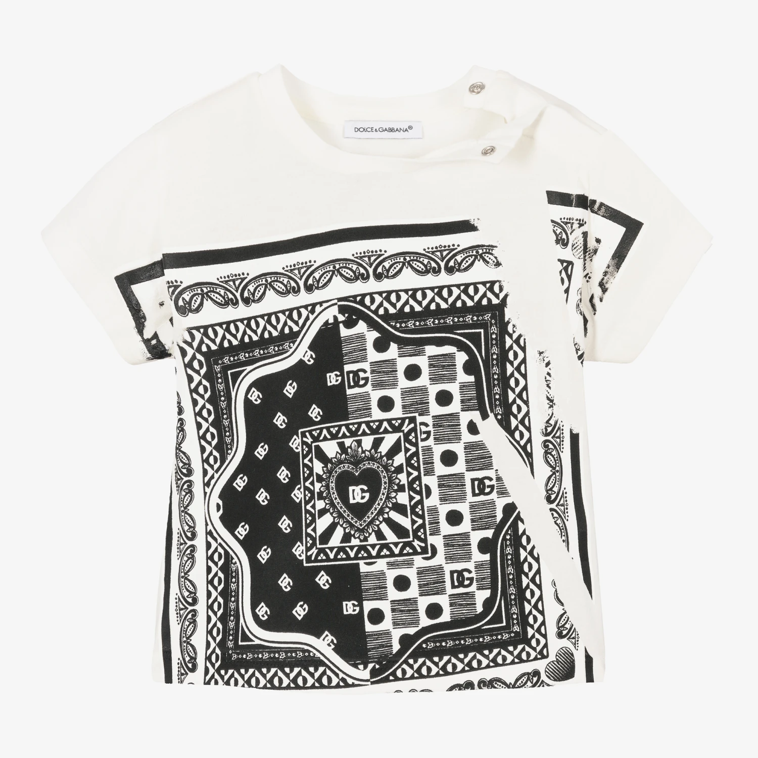 Younger boys white cotton T-shirt by Dolce & Gabbana. Featuring a distressed monochrome bandana logo print, this luxury design is soft and comfortable to wear and has popper fastenings on one shoulder for easy dressing and changing.