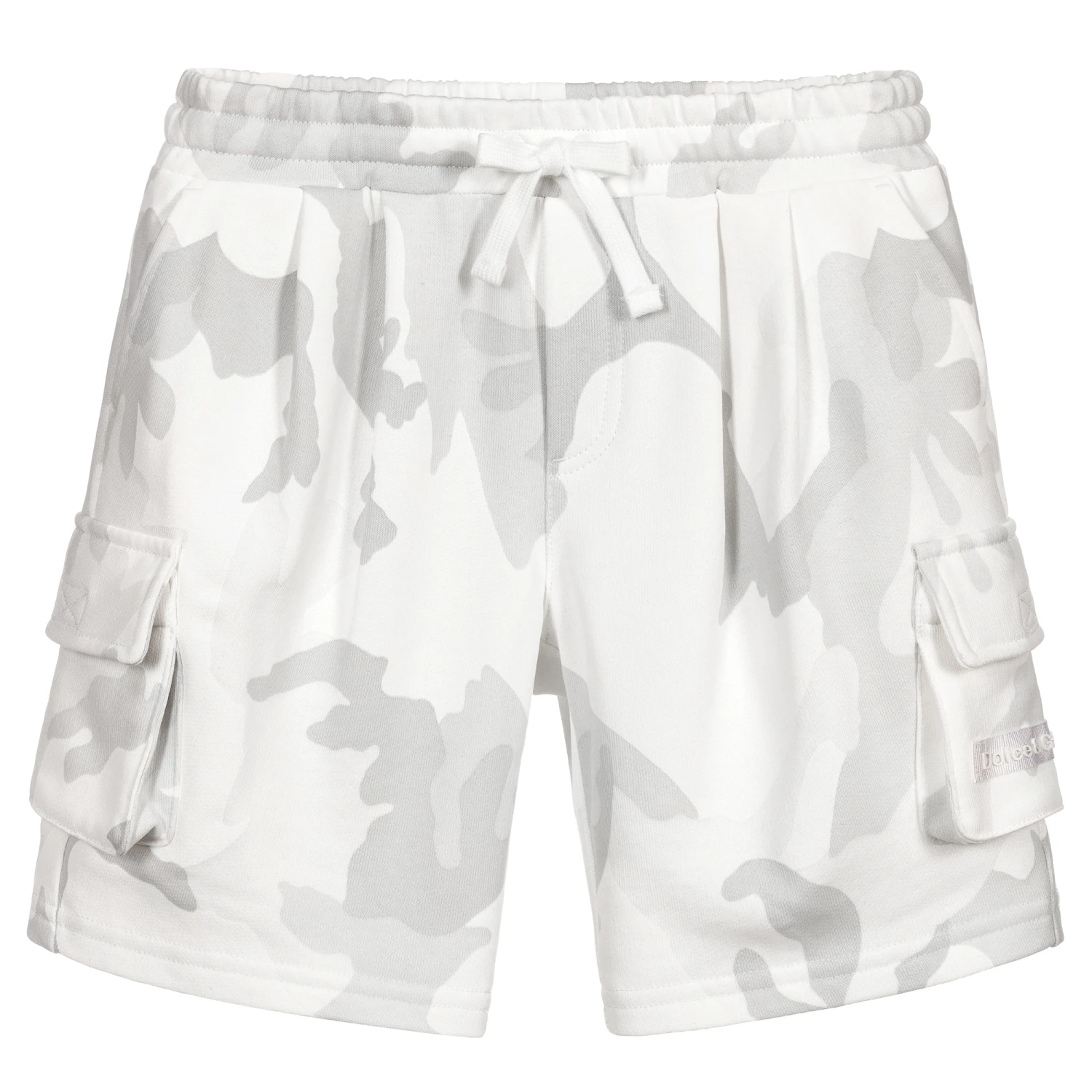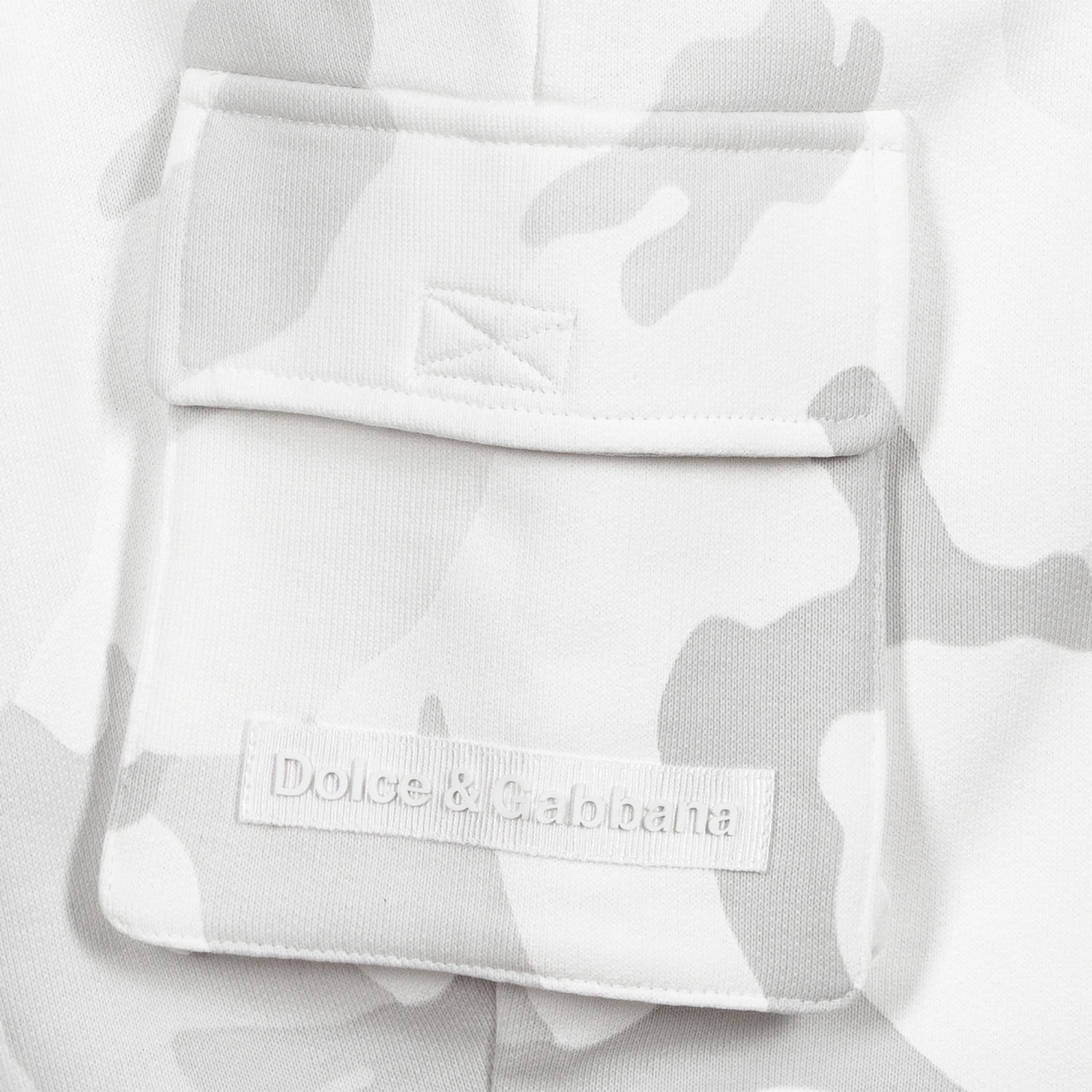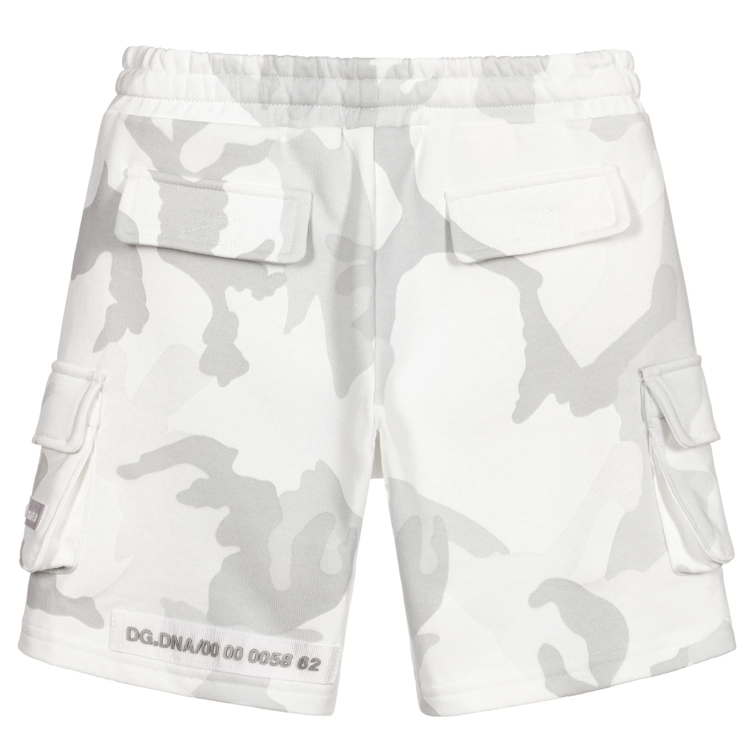 Mini-me white shorts for boys by luxury Italian brand Dolce & Gabbana, made in mid-weight cotton sweatshirt jersey. They are patterned with the brand’s camouflage print in shades of grey, with a drawstring waist and velcro fastening cargo pockets on each leg. There are white and grey logo tapes on one pocket and the back of one leg.