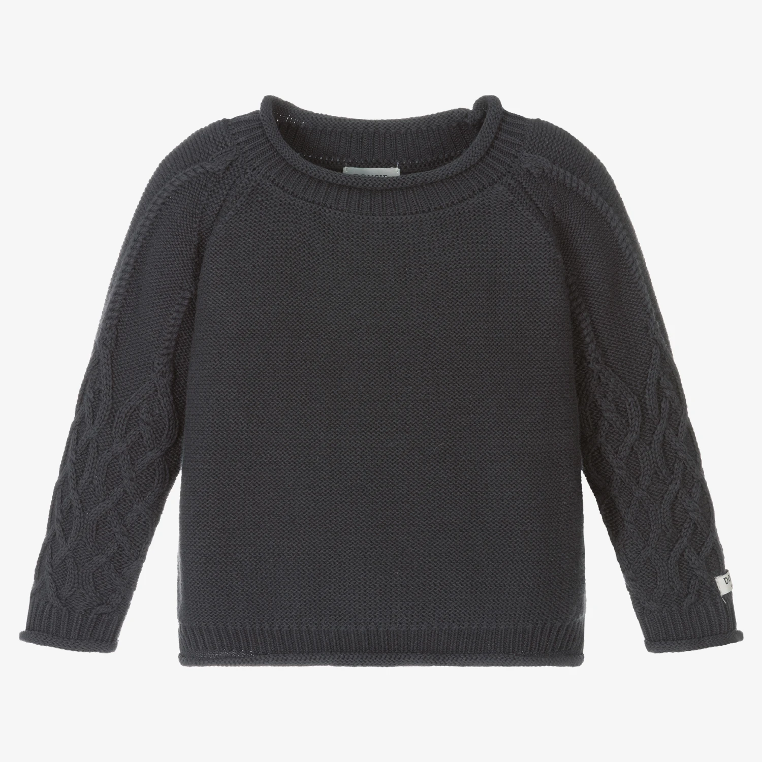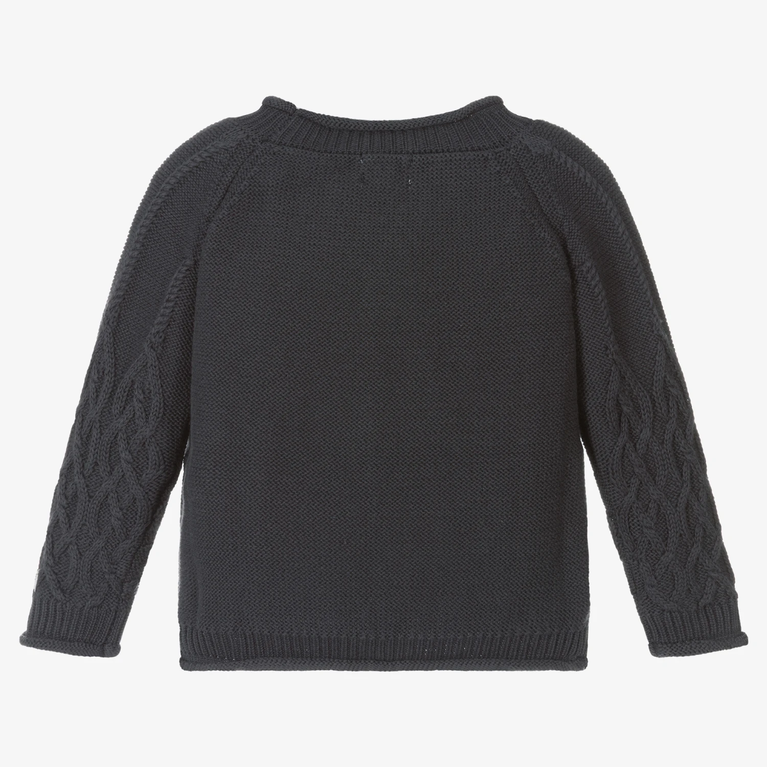 Handmade cute navy blue sweater for boys and girls by Donsje, knitted in soft cotton for comfort and warmth. It has cable knit pattern on the arms, sweet rolled trims and the brand’s logo patch is stitched on one arm.