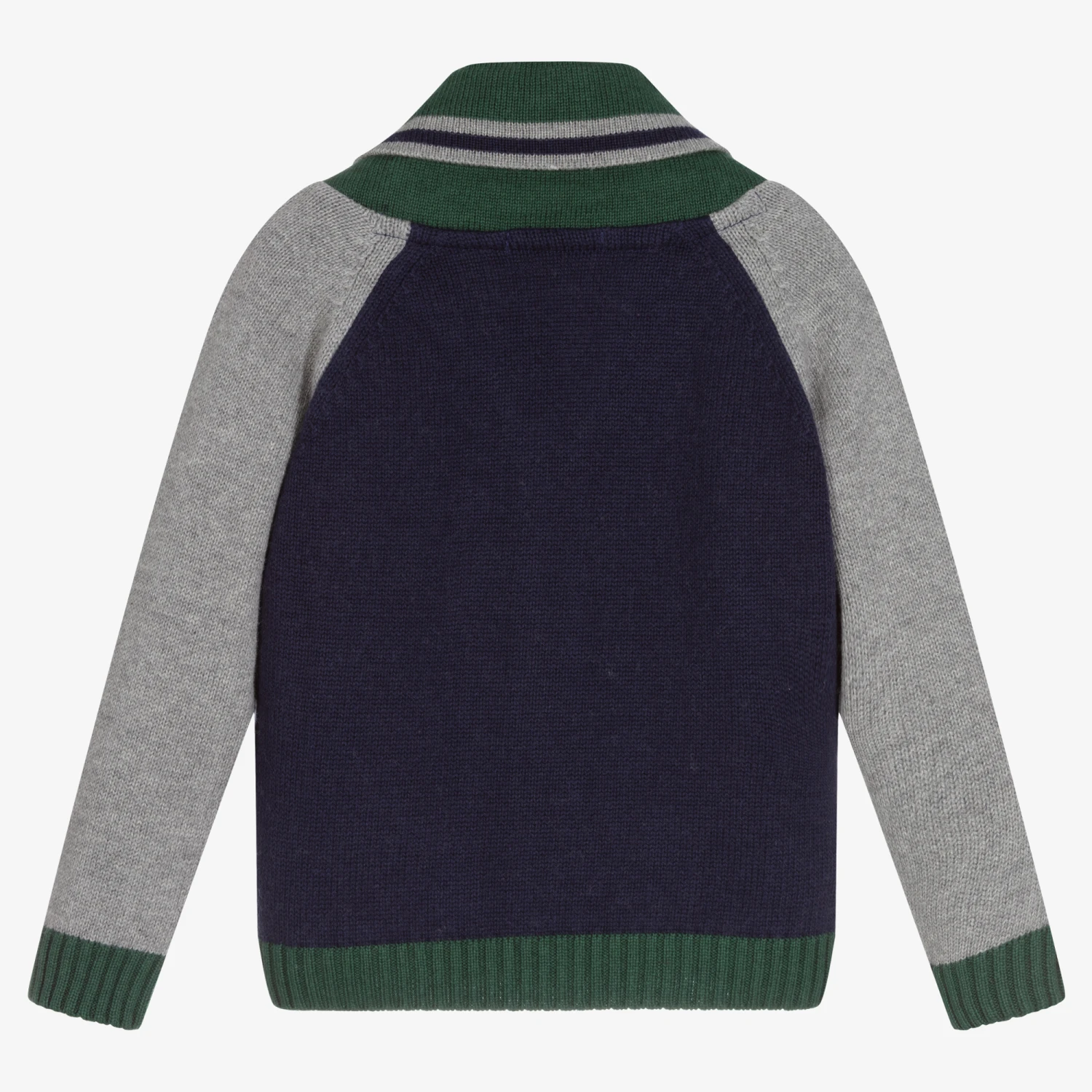 Younger boys cardigan from Dr. Kid, in navy blue, grey and green. Knitted in a soft cotton and wool blend, it has striped detail on the shawl collar and faux pockets.
