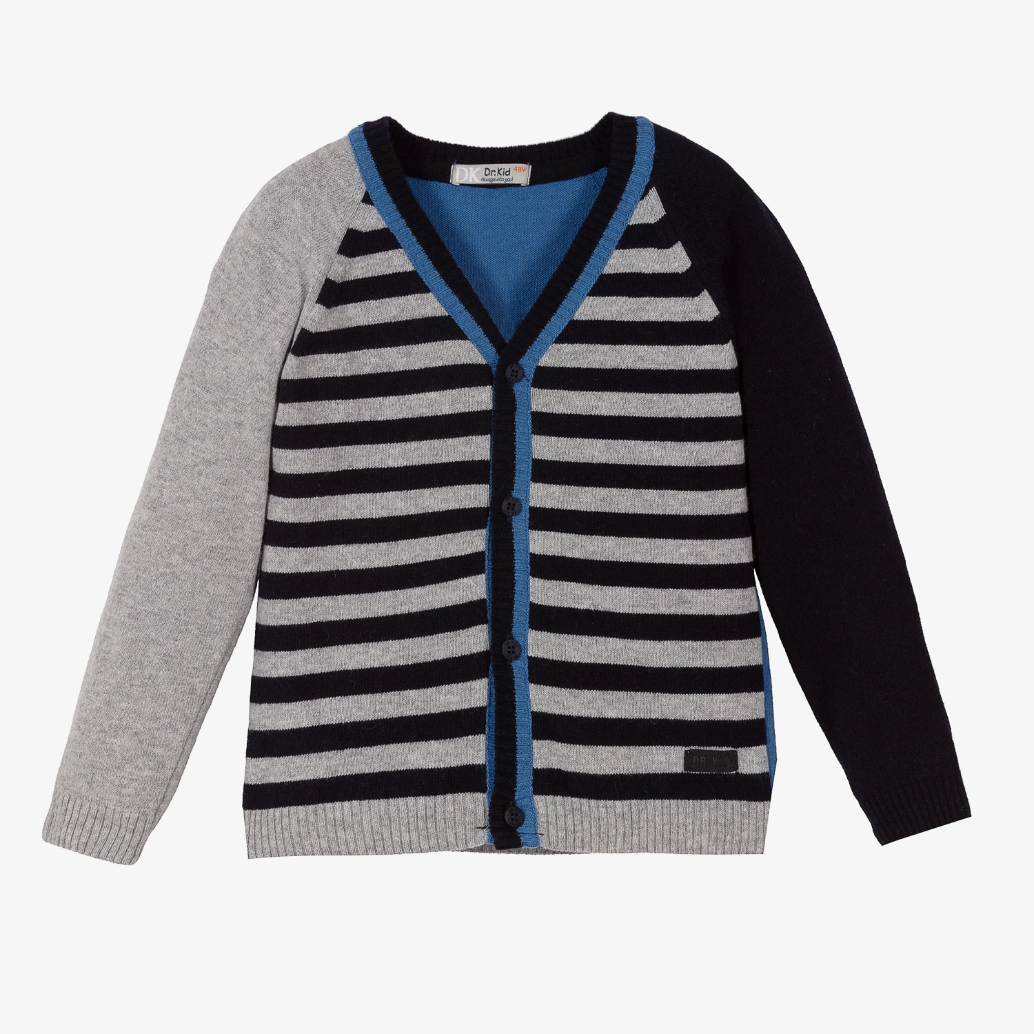 Blue and grey V-neck cardigan for little boys from Dr. Kid, knitted in a soft wool and cotton blend. It has a striped front and colour blocks of navy blue, grey and bright blue on the sleeves and back. There are branded button fastenings on the front and a logo patch near the hem.