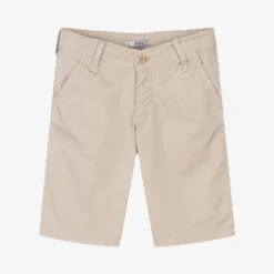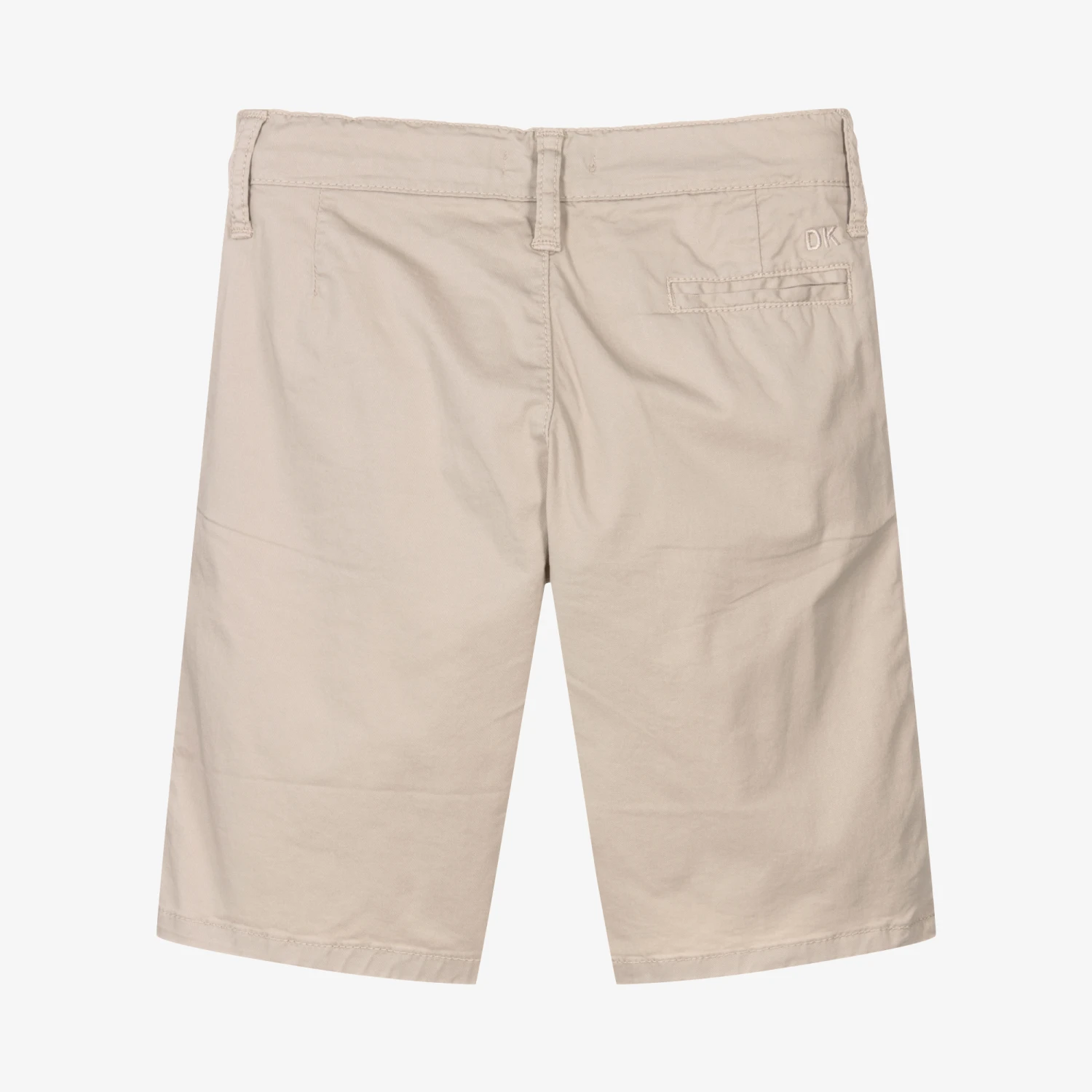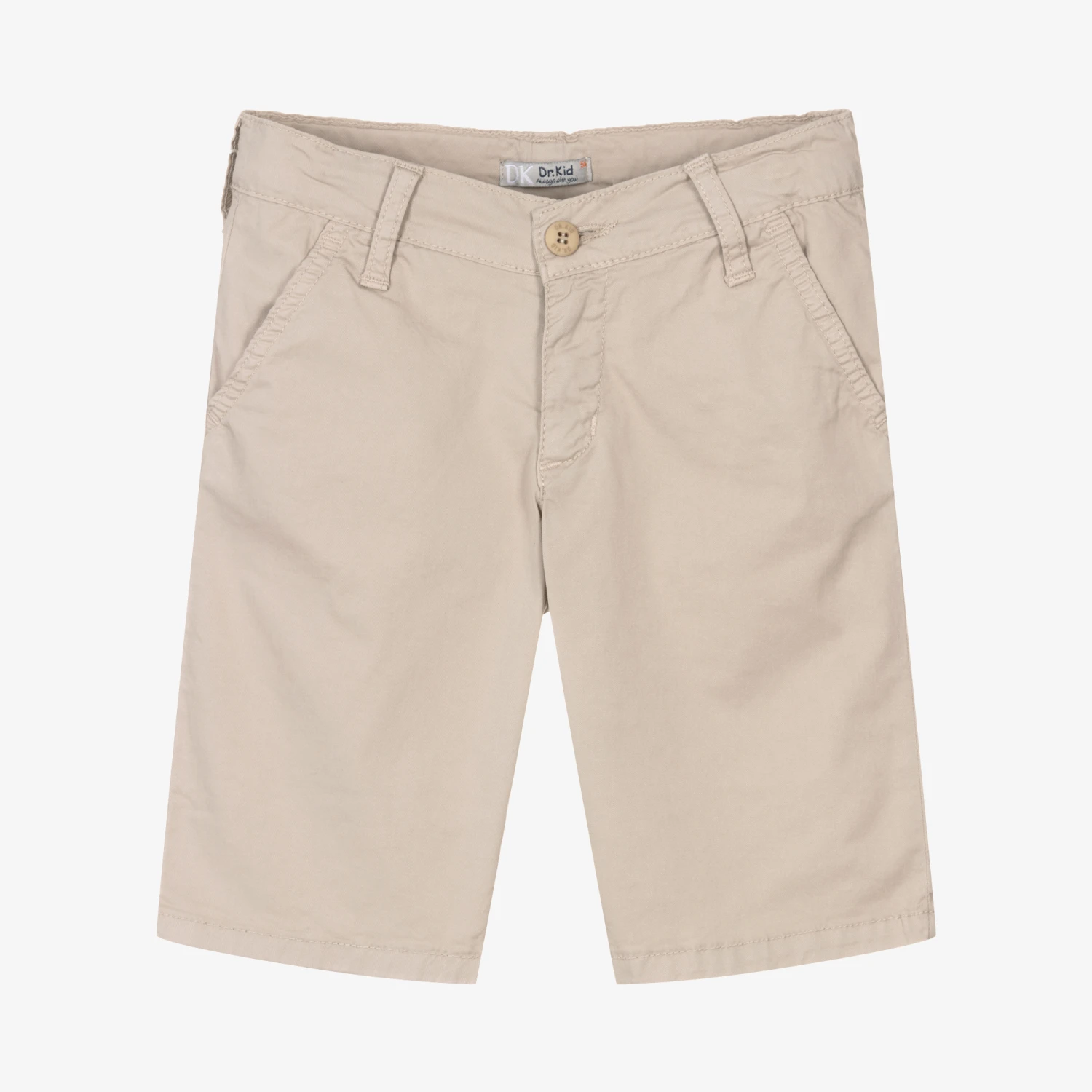 Beige shorts for boys by Dr. Kid, made in a smooth cotton twill with a slight stretch. They have an adjustable waistband and fasten with a zip and branded button. There are two slanted front pockets, a jetted back pocket and a tonal embroidered logo on the back for a subtle designer finish.