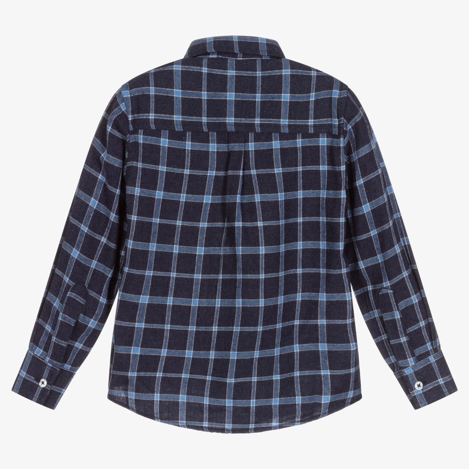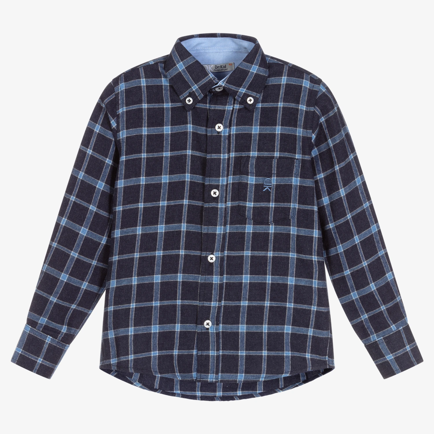 Navy blue, pale blue and white checked shirt for boys by Dr. Kid. Made in soft cotton blend twill, it has a button-down collar and a patch pocket with an embroidered blue logo.