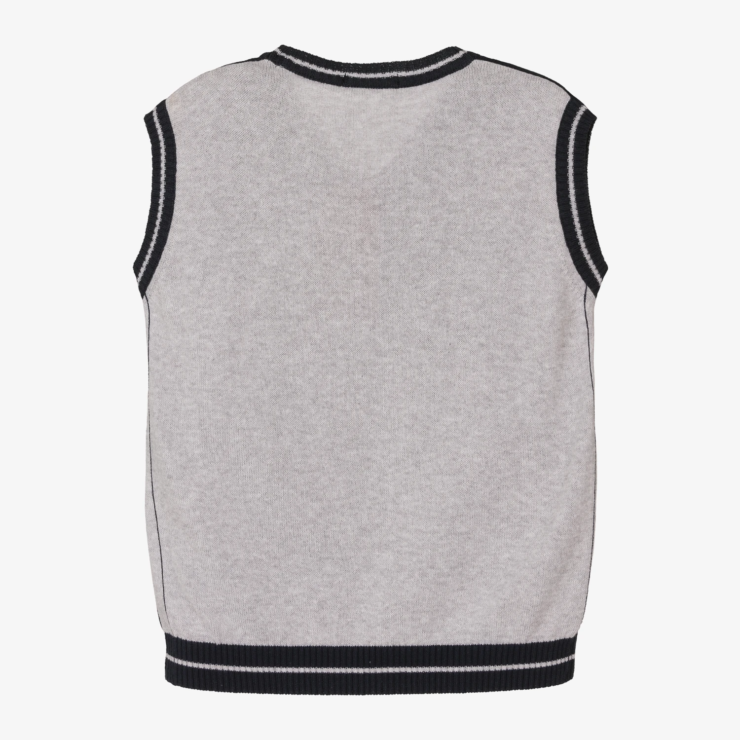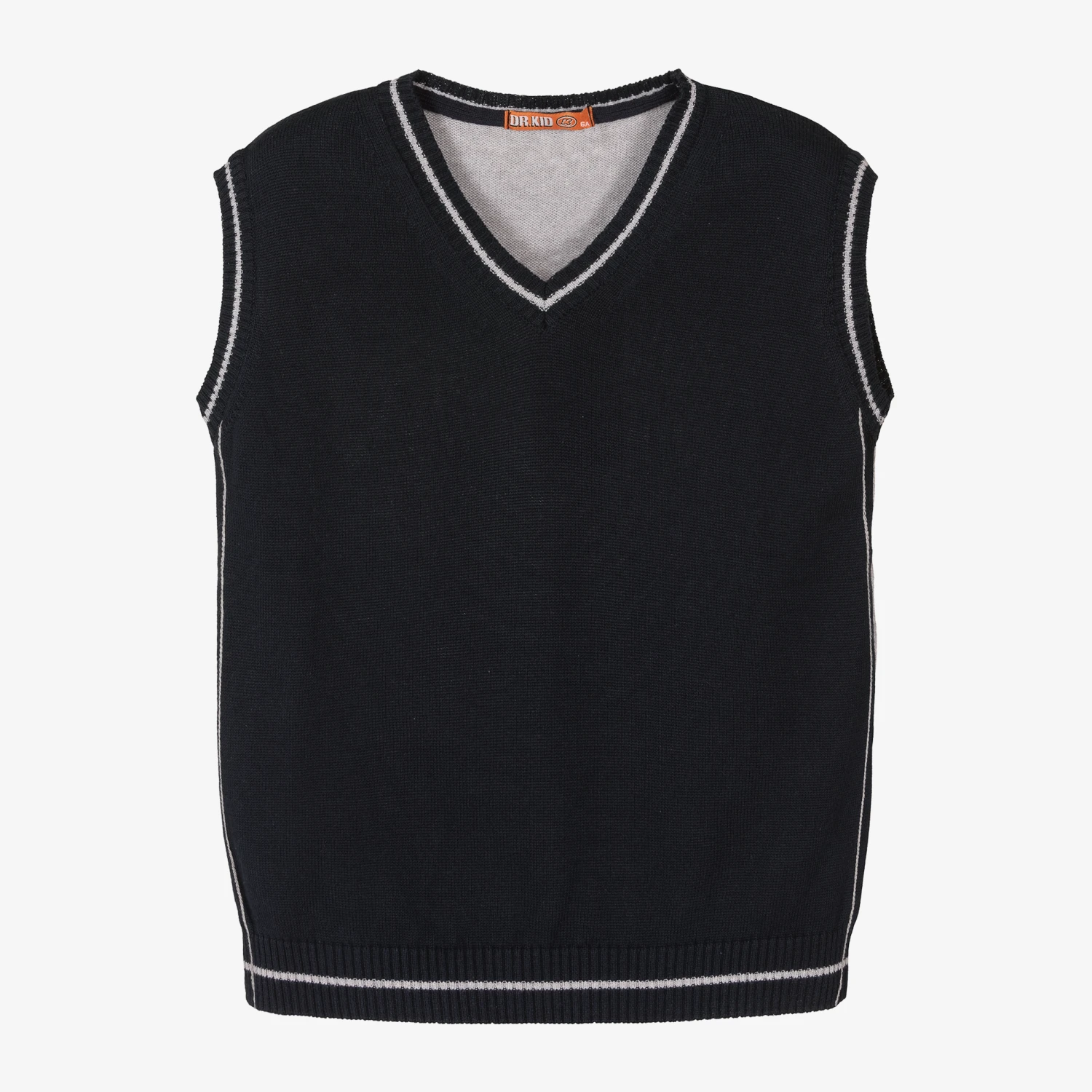 Navy blue on the front and grey marl on the back, this V-neck slipover for boys is by Dr. Kid. Great for adding a lightweight layer of warmth, it is finely knitted in soft cotton.