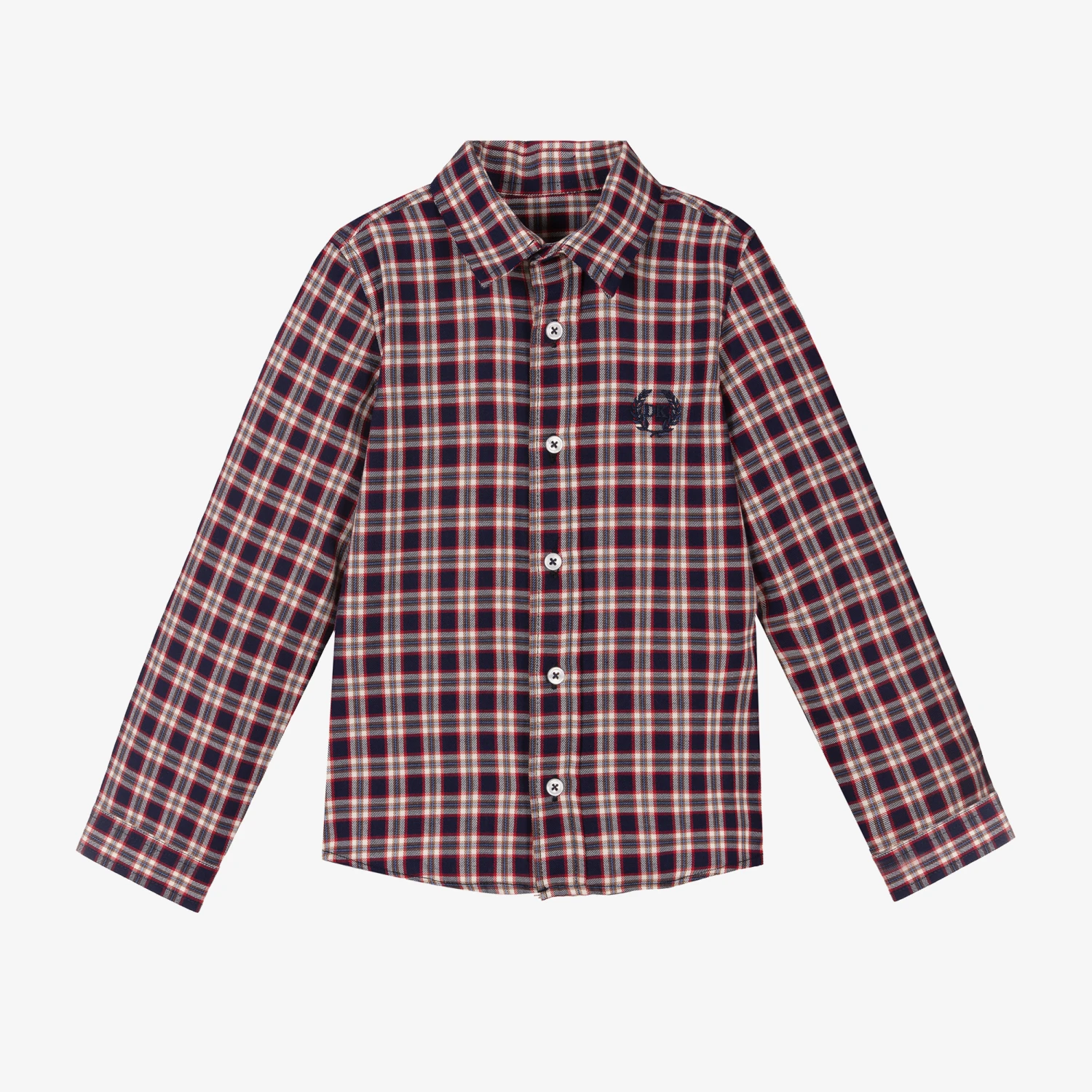 Timelessly stylish, navy blue and red checked shirt for little boys by Dr. Kid. Made in cotton twill, it fastens on the front with pearlized buttons and has an embroidered logo on the chest. It has pale blue elbow patches and side patches for a fun twist on a classic item.