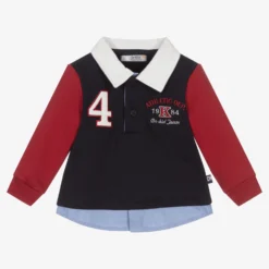 Navy blue rugby shirt for little boys by Portuguese brand Dr. Kid, with red sleeves. Made in comfortable polycotton jersey with a fleecy inside, it has pale blue Oxford cotton trim under the collar and below the hemline, giving the appearance of a shirt. There are logo button fastenings on the placket.
