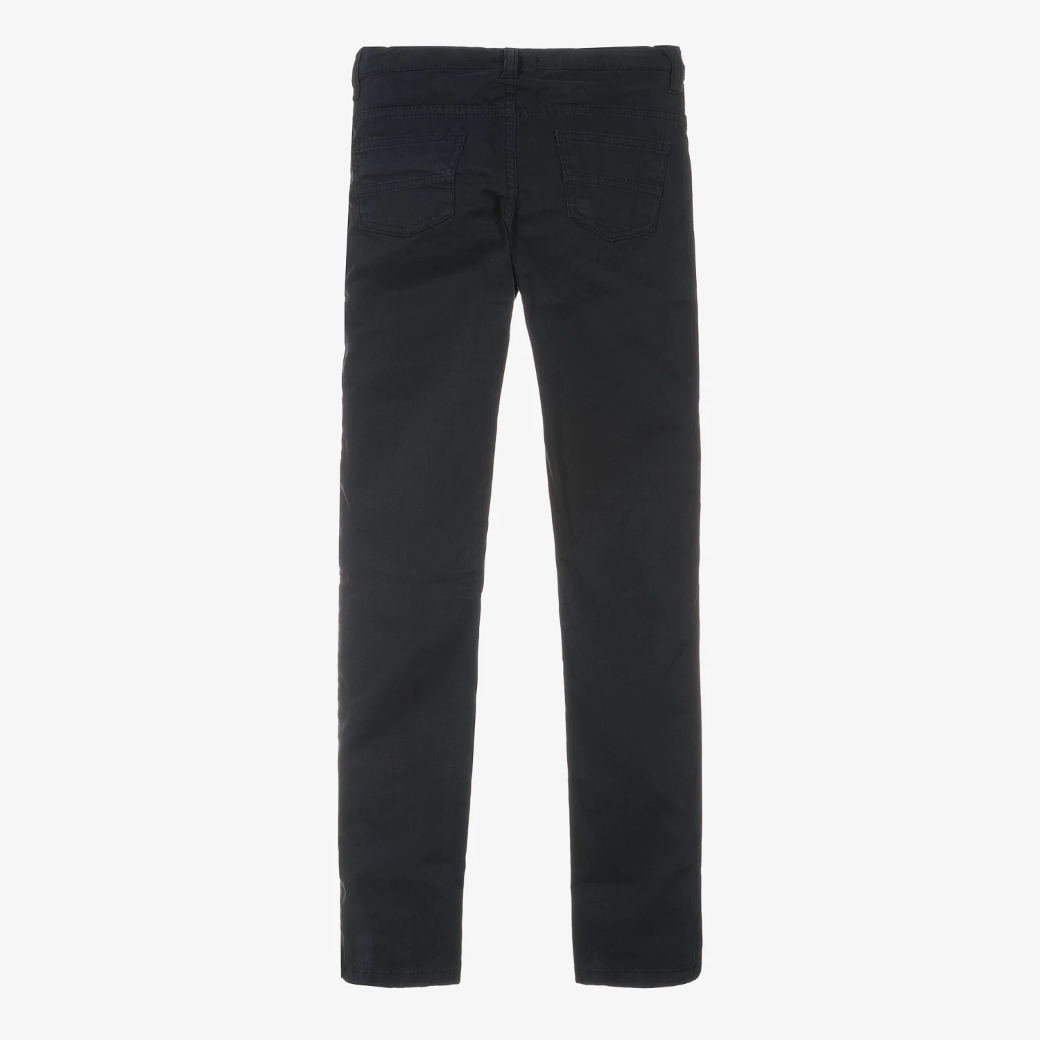 Comfortable navy blue straight-leg trousers for boys by Dr. Kid. Made in a soft cotton, with a slight stretch, they fasten with a button and zip at the front. In a classic five-pocket style, they have an adjustable waist to ensure a good fit, and there is an embroidered logo on the coin pocket, for a discreet designer finish.