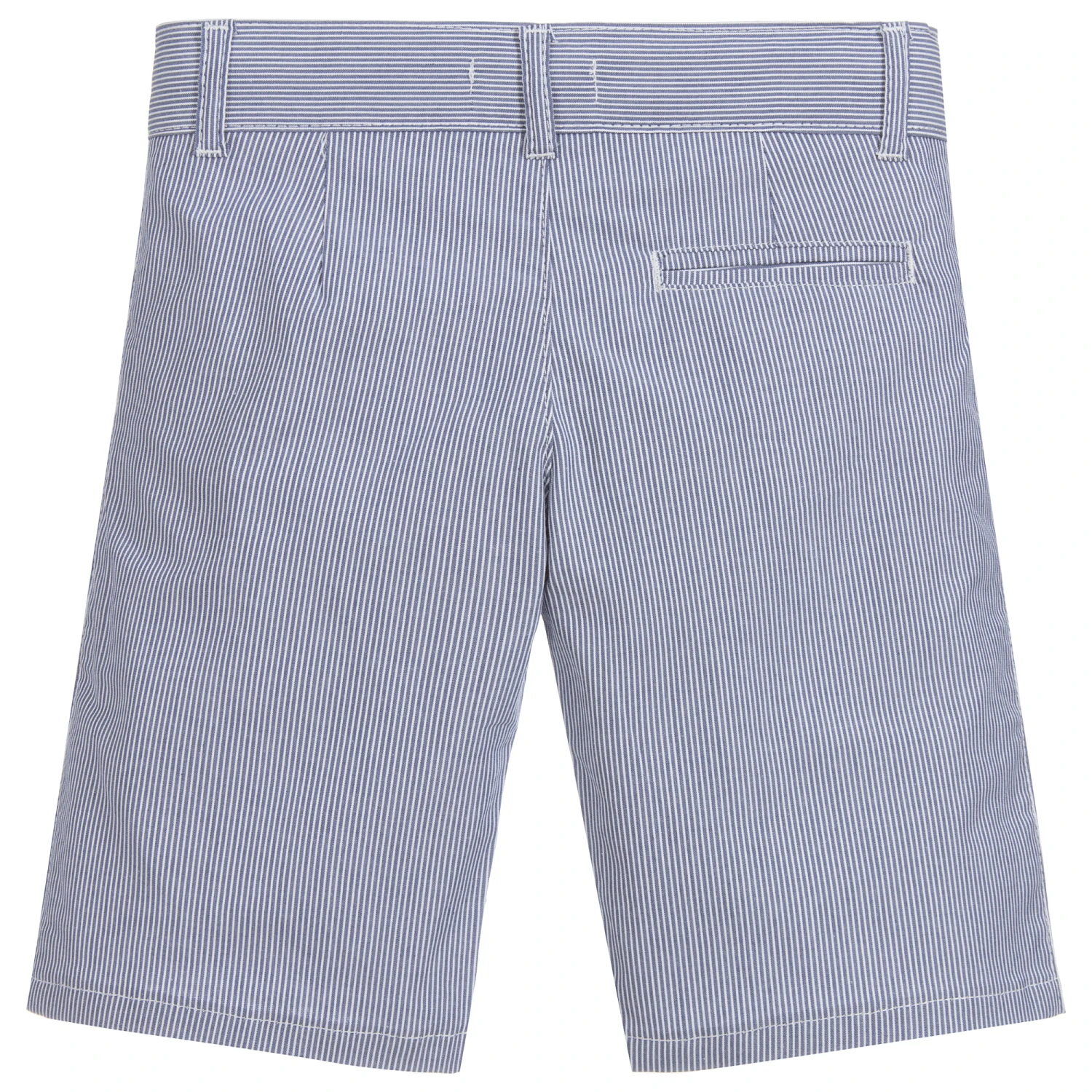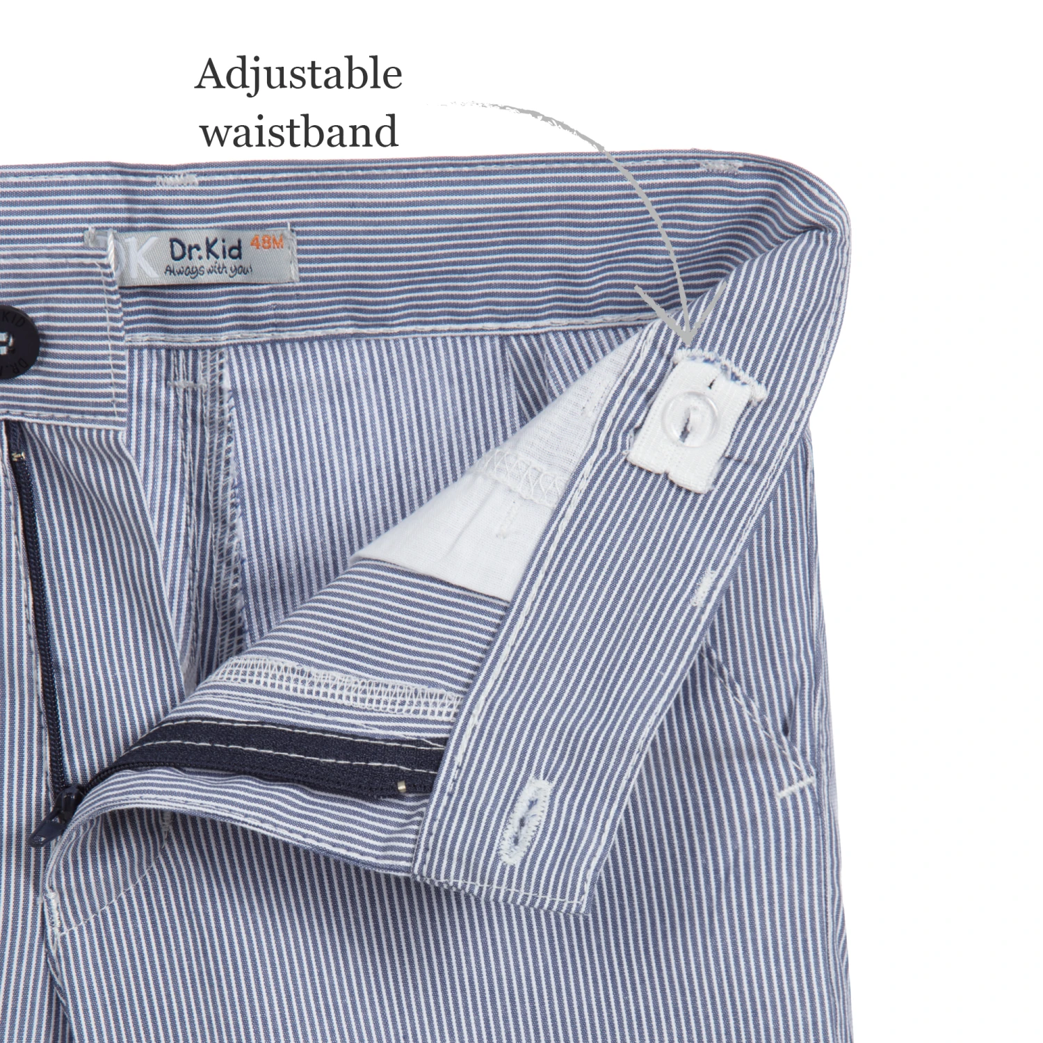 Little boys blue and white striped chino shorts by Dr. Kid, made in soft, lightweight cotton. They have three pockets, and a button and zip fastening.