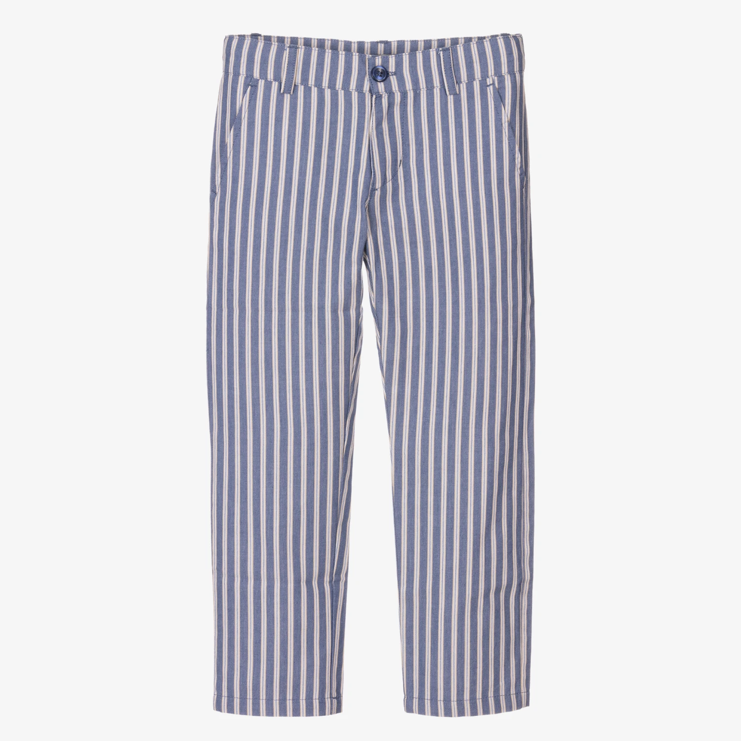 In a blue, beige and white stripe, these smart-casual trousers for boys are by Dr. Kid. Woven in lightweight cotton, they fasten with a zip and button on the front, and have an adjustable waistband for a comfortable fit. There are slanted pockets at the hips, with an additional slip pocket on the back.