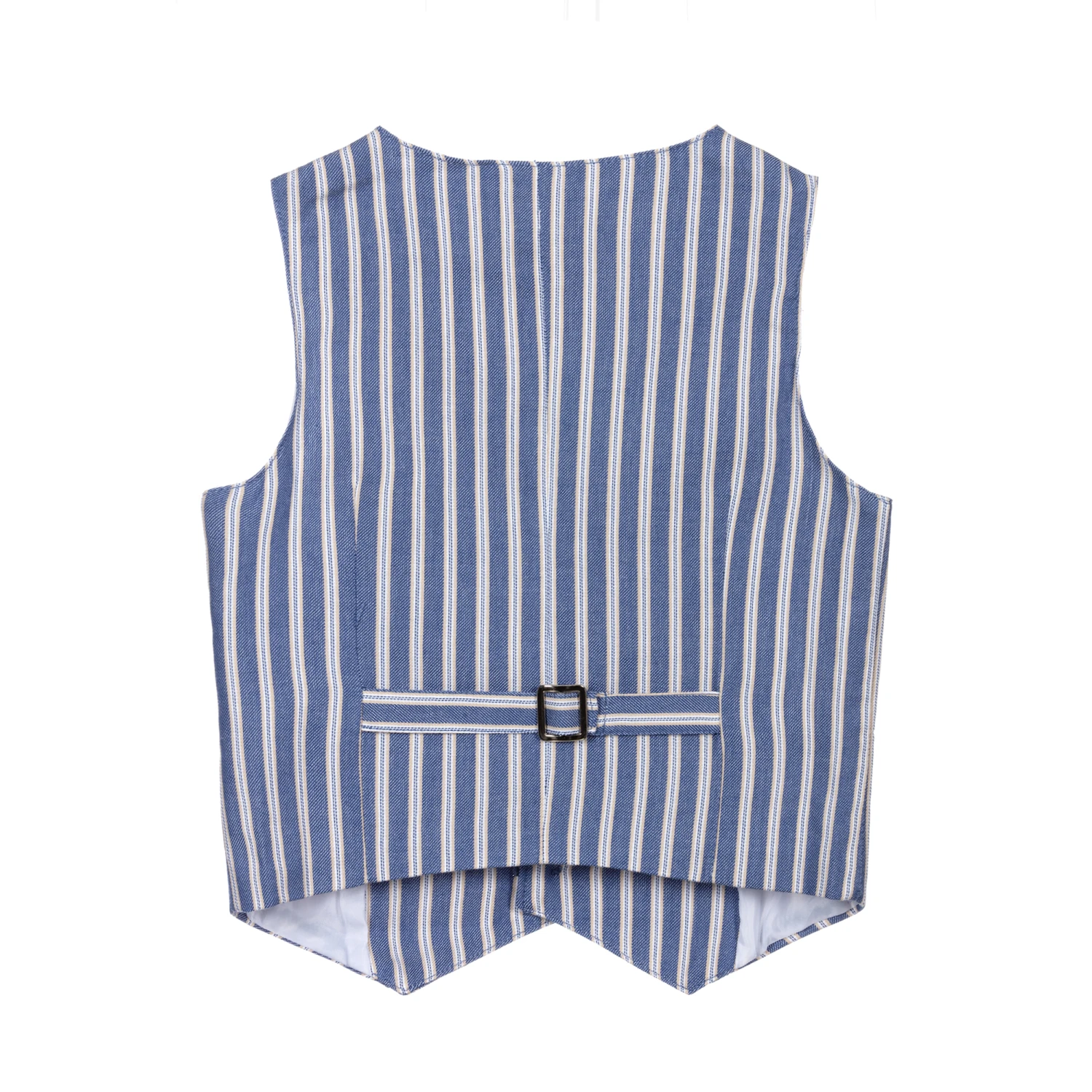 Blue, beige and white striped waistcoat for little boys by Dr. Kid. It is made in lightweight cotton and has a silky satin lining.