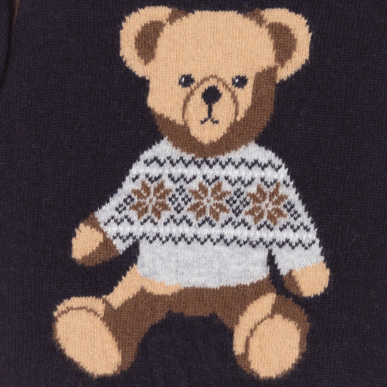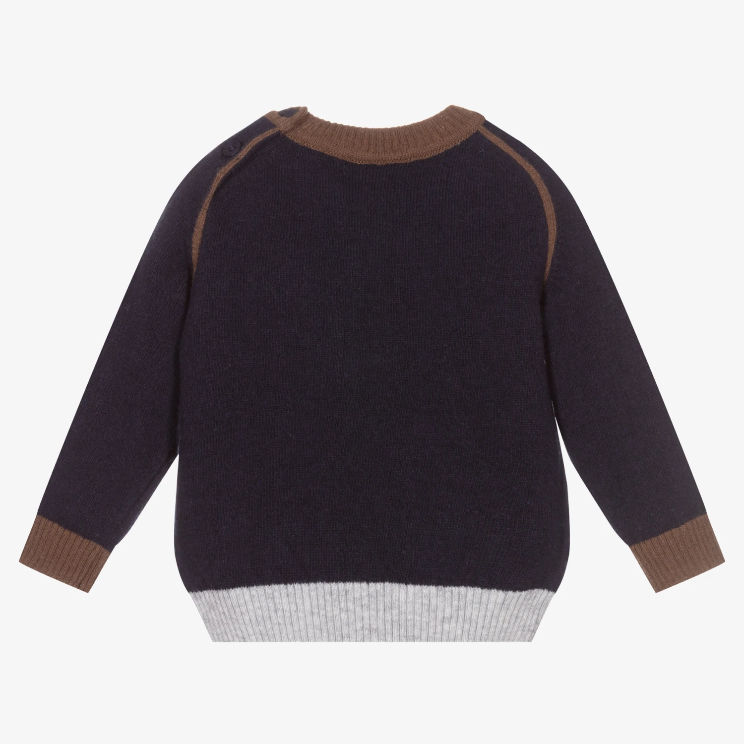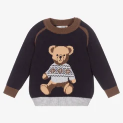 Navy blue sweater for little boys by Portuguese brand Dr. Kid, with brown and grey trims. Knitted in a cotton and wool blend, it has a brown teddy bear knitted into the weave. There are useful logo button fastenings on one shoulder.